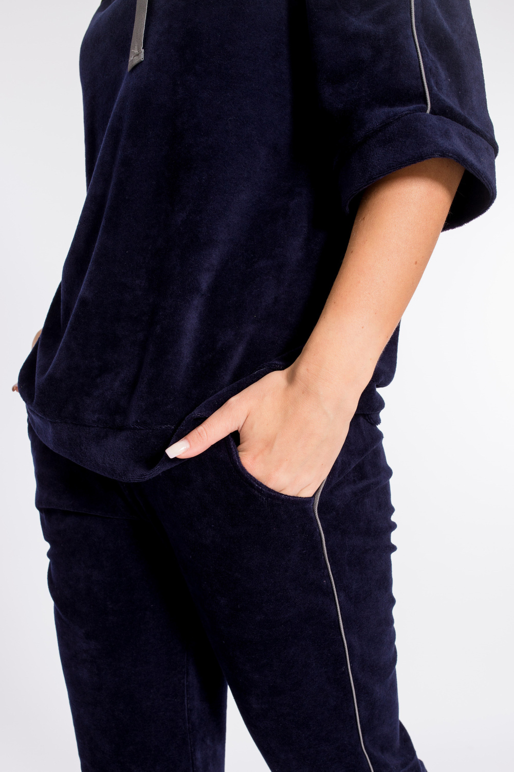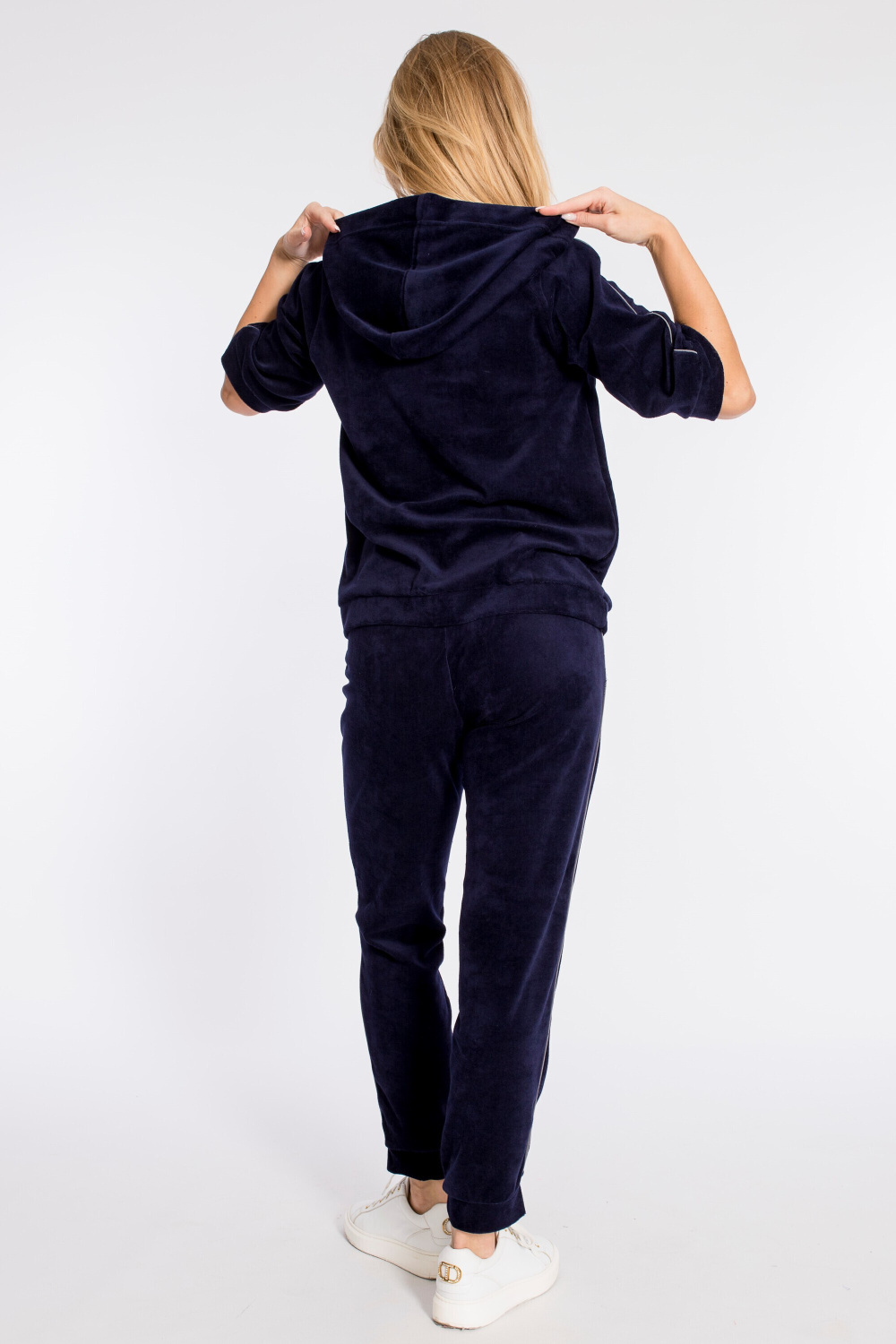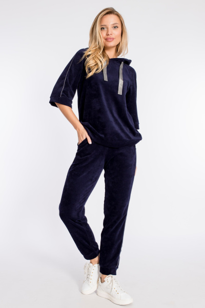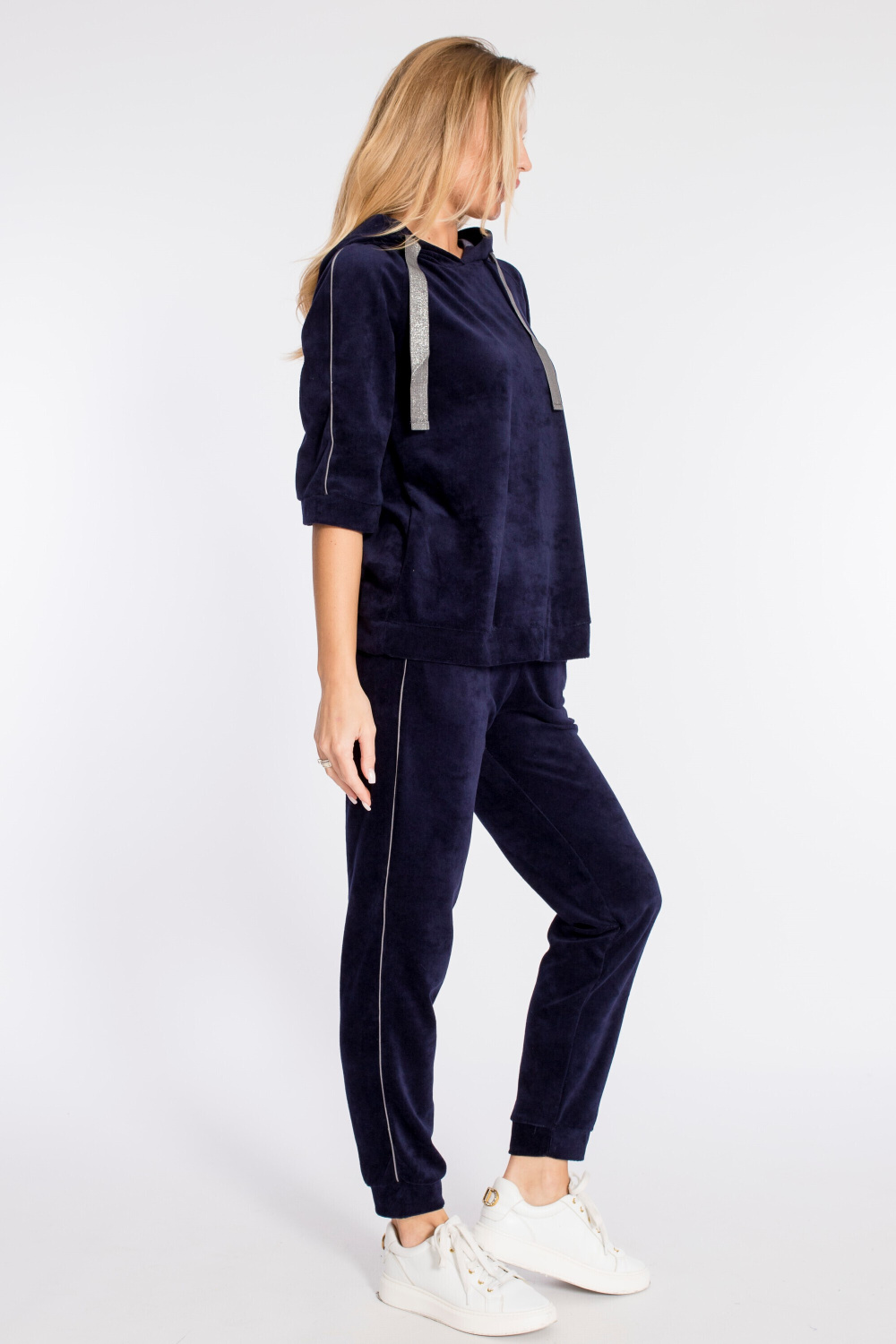 Женский костюм выполнен из велюра. Толстовка с капюшоном, рукавами реглан длиной 3/4, с отделочным кантом. Брюки длинные, с карманами и кантом в боковых швах. Пояс брюк на резине, низ с манжетами.