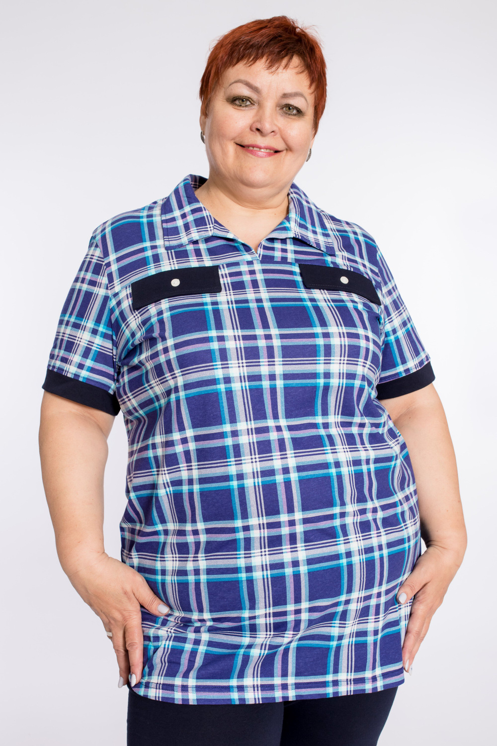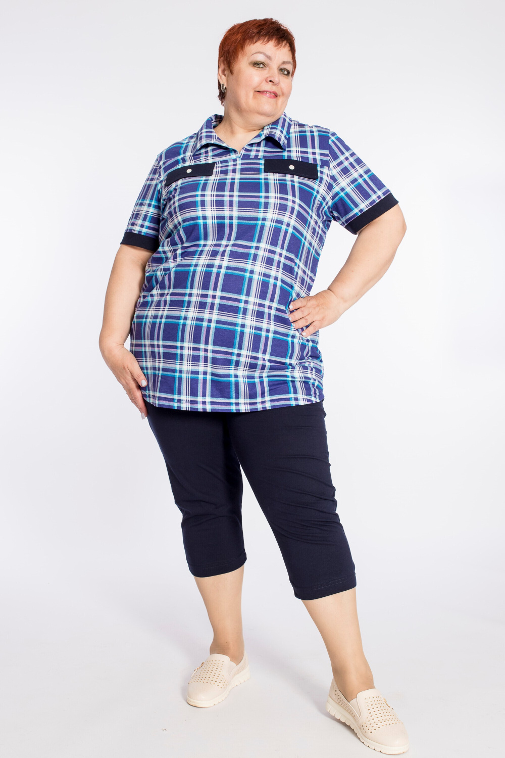 Женский костюм выполнен из кулирки, состоит из футболки с воротником и капри. Капри однотонные, с поясом на резинке. Футболка с рисунком в клетку с однотонной отделкой клапанами спереди и на рукавах.