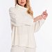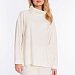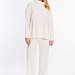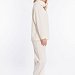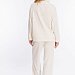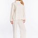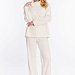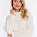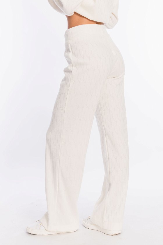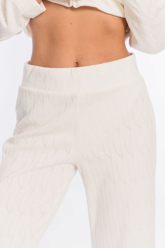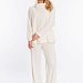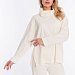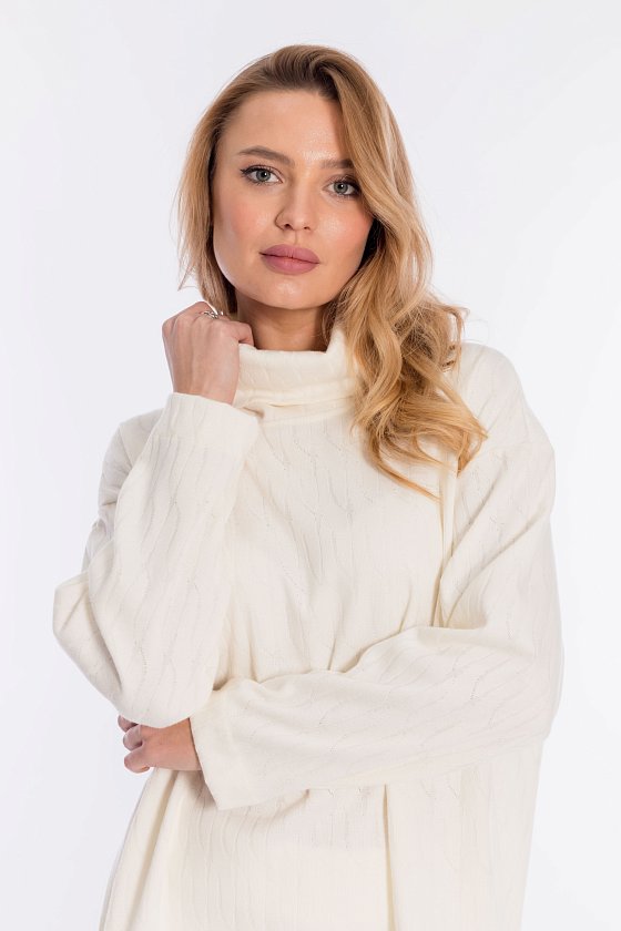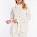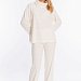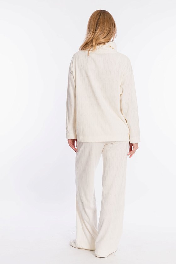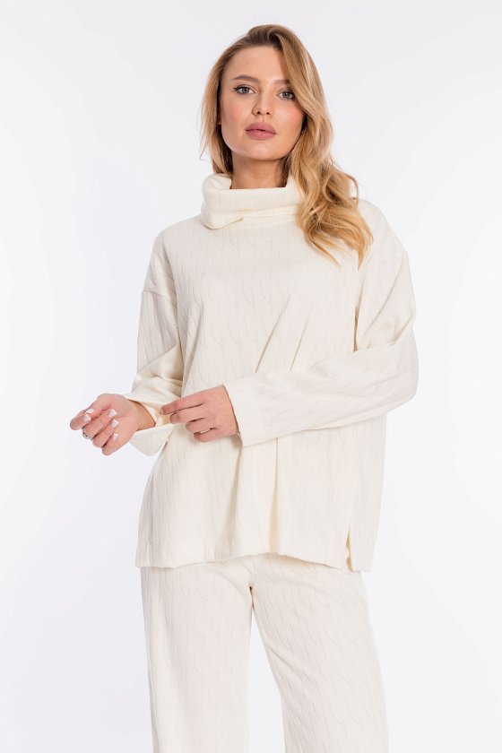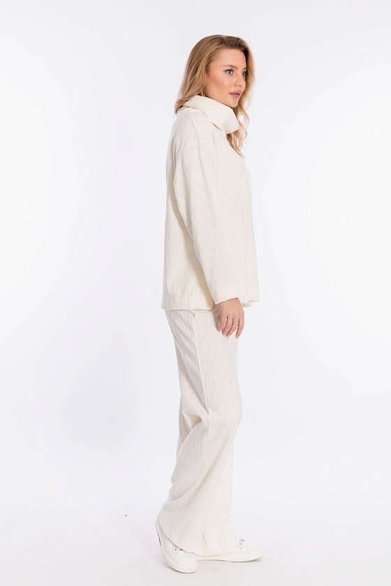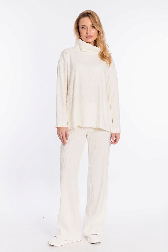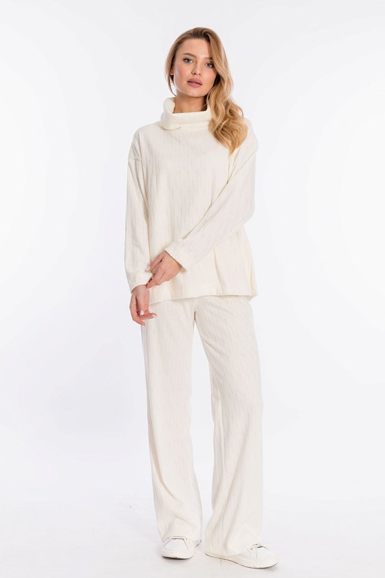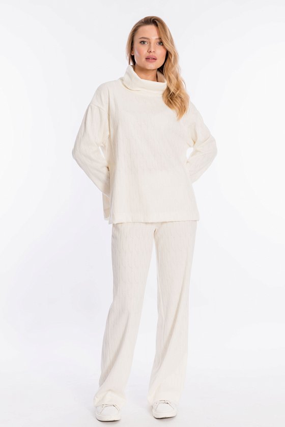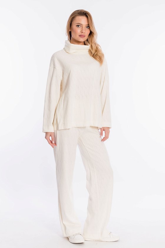 Тёплый костюм свободного кроя выполнен из мягкого и шелковистого полотна с имитацией ручной вязки. Джемпер свободный, с воротником-труба, по бокам разрезы по типу шлиц. Брюки комфортной посадки, свободные, внизу широкие. Пояс на резине.