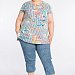 Костюм выполнен из х/б полотна. Футболка с коротким спущенным рукавом, крой прямой, свободный, по бокам разрезы. Горловина имеет круглый вырез. Капри с карманами, по бокам внизу небольшие разрезы.