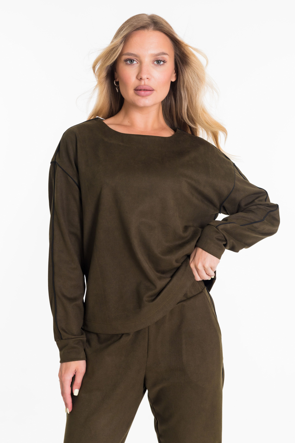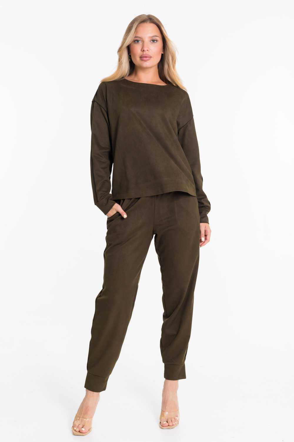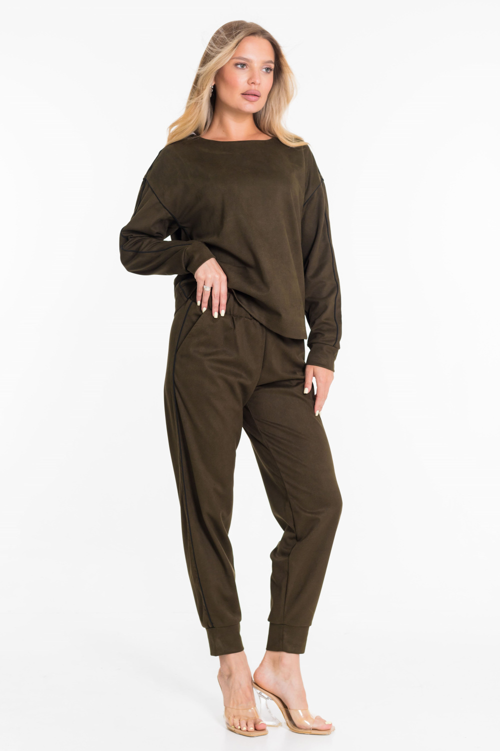 Женский костюм из материала «замша диагональ» состоит из джемпера и брюк, гармонично сочетающихся между собой. Джемпер свободного кроя с длинным рукавом и округлым вырезом горловины обеспечивает удобство и мягко подчеркивает фигуру. Брюки на резинке комфортно сидят по талии, имеют свободный силуэт и универсальную длину, что делает их практичными для повседневной носки. Материал «замша диагональ» приятный на ощупь, мягкий, создаёт ощущение уюта и добавляет образу элегантности. Костюм легко вписывается как в повседневный гардероб, так и в более нарядные комплекты.
