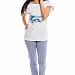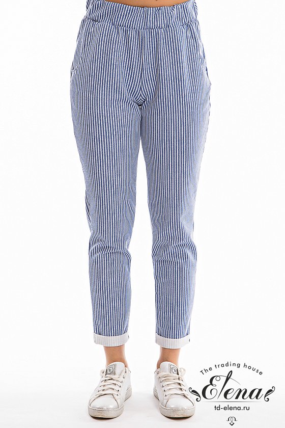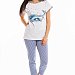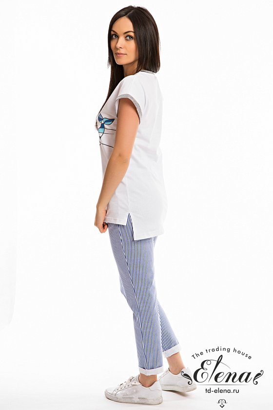 Костюм молодежный, состоит из футболки и брюк. Брюки из футер петли с лайкрой в вертикальную полоску. Пояс брюк на резинке, по бокам расположены карманы. Футболка из белой кулирки, горловина и низ рукавов с отделкой из вискозы. Спереди расположен красивый принт.