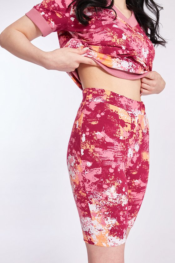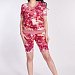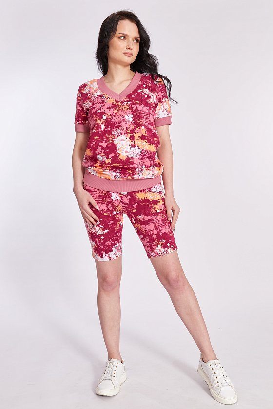 Костюм выполнен из футер петли с лайкрой. Состоит из шорт и футболки. Футболка с коротким втачным рукавом, горловина имеет V-образный вырез. Горловина, низ рукавов и пояс футболки с планками из кашкорсе. Шорты с поясом на резине.
