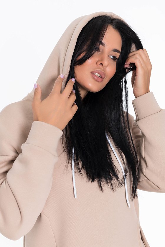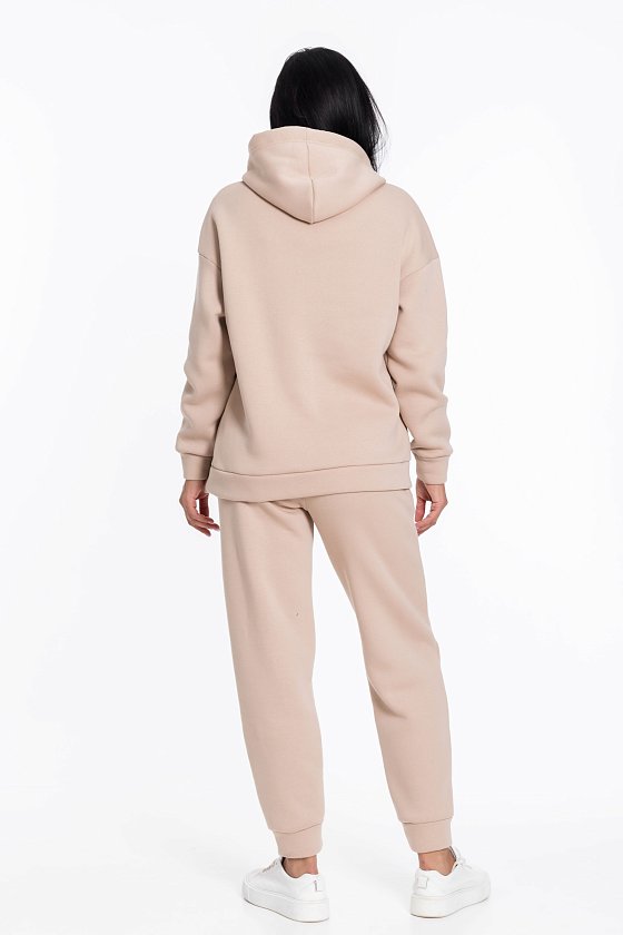 Костюм состоит из толстовки с капюшоном и брюк. Толстовка имеет притачный пояс и манжеты, которые обеспечивают комфортную посадку. На полочке есть рельефы и левый рельеф с разрезом, что придаёт модели оригинальность.