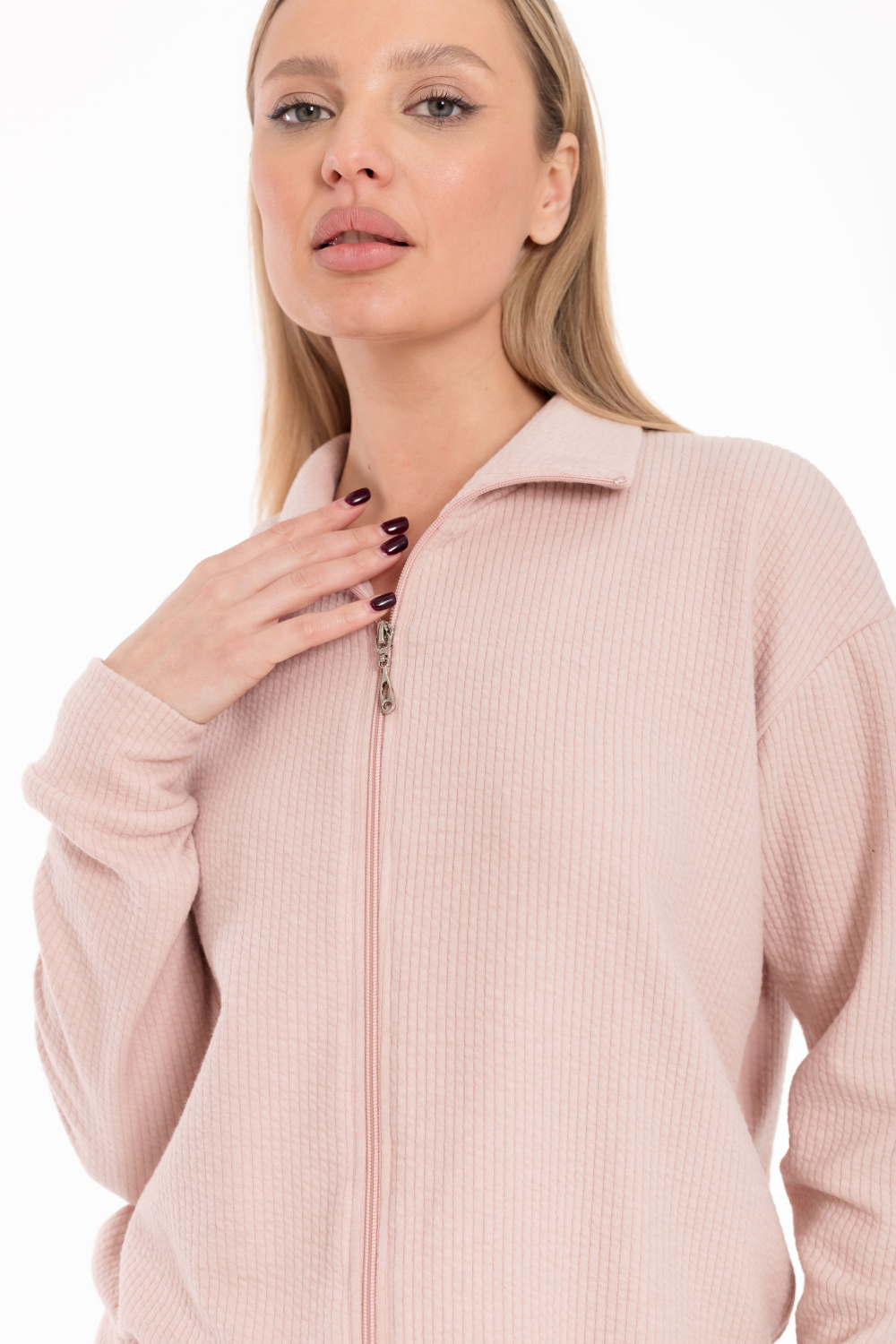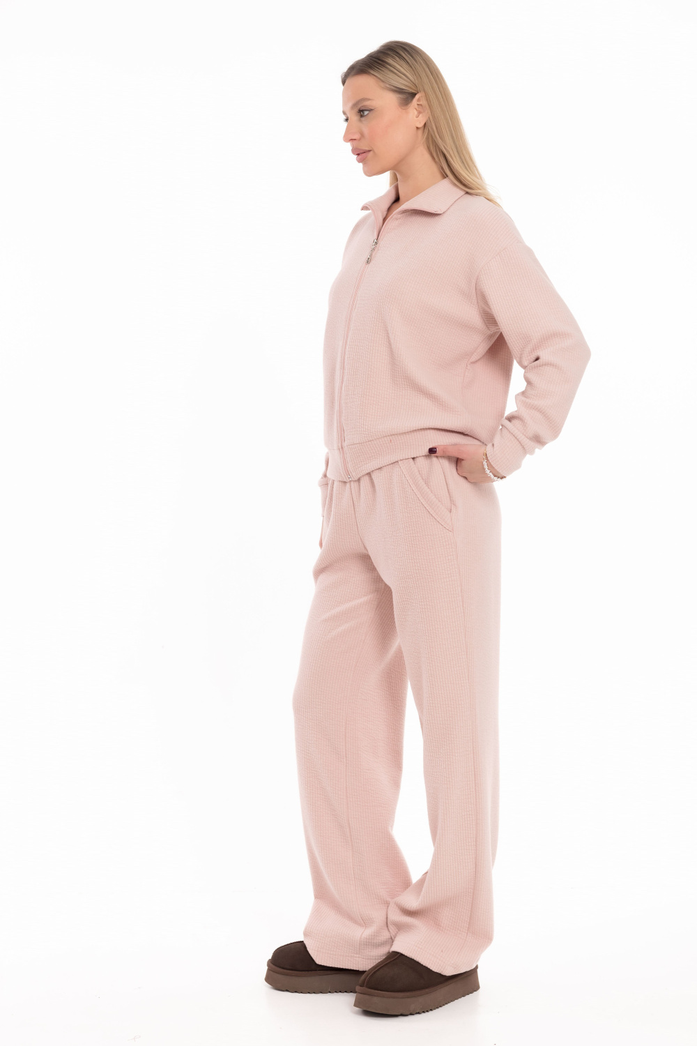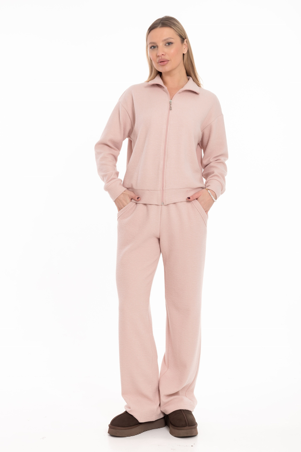 Женский костюм выполнен из плотного и фактурного интерлока с небольшим начесом, который обеспечивает тепло и комфорт. Комплект состоит из практичной толстовки с застёжкой на молнии, длинным спущенным рукавом и уютным воротником-стойкой, а также элегантных свободных брюк с удобными боковыми карманами и поясом на резинке. Этот универсальный ансамбль идеально подходит для прогулок, отдыха дома и создания стильного повседневного образа в прохладную погоду.