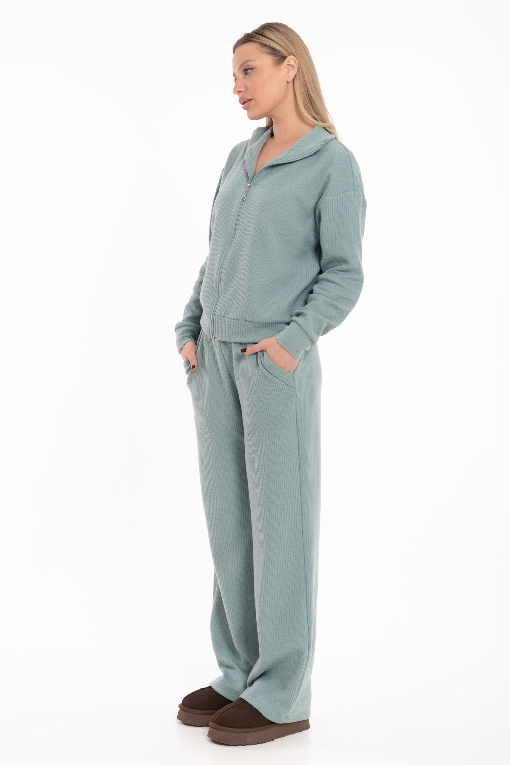 Женский костюм выполнен из плотного и фактурного интерлока с небольшим начесом, который обеспечивает тепло и комфорт. Комплект состоит из практичной толстовки с застёжкой на молнии, длинным спущенным рукавом и уютным воротником-стойкой, а также элегантных свободных брюк с удобными боковыми карманами и поясом на резинке. Этот универсальный ансамбль идеально подходит для прогулок, отдыха дома и создания стильного повседневного образа в прохладную погоду.