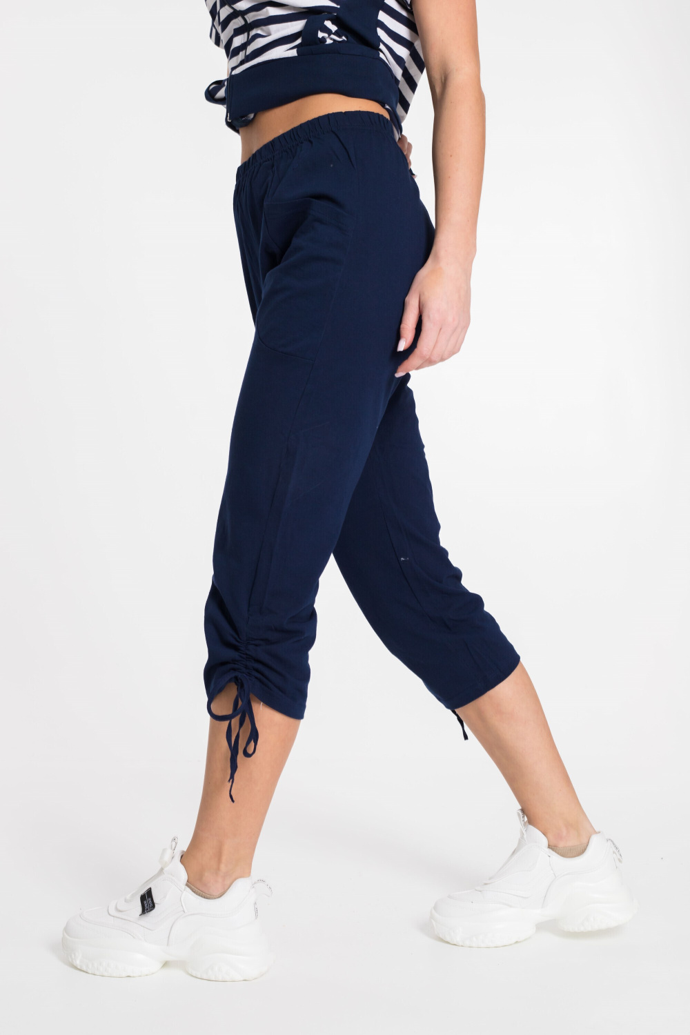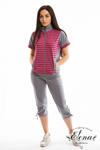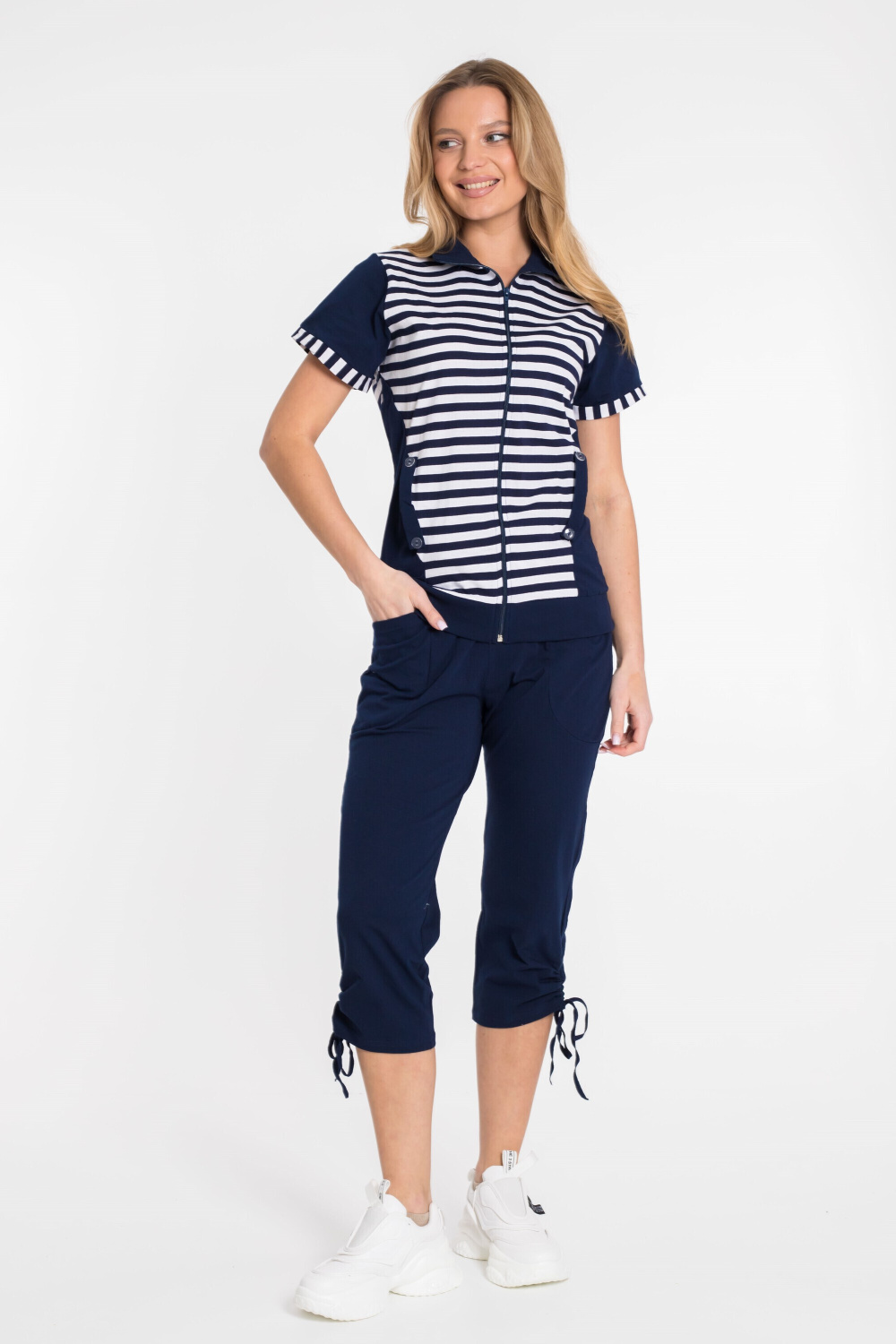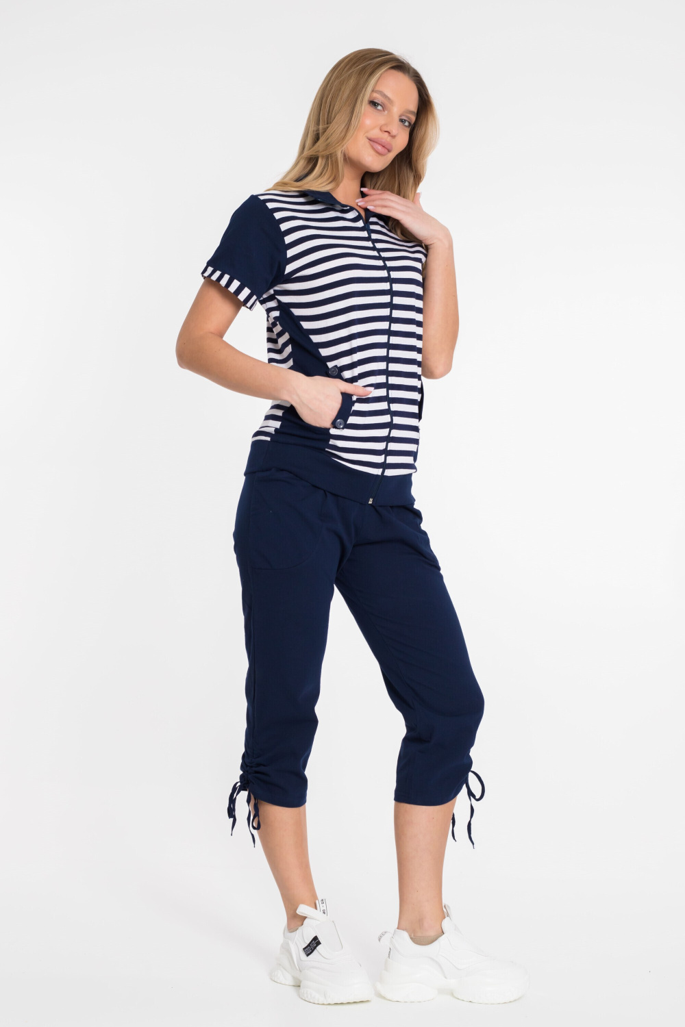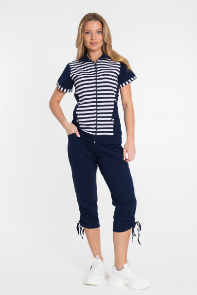 Женский костюм выполнен из хлопкового полотна. Удлинённая футболка с высоким воротником спереди застёгивается на молнию. Украшена вставками из полотна в полоску и боковыми карманами. Капри прямого покроя с накладными карманами, по бокам стягиваются при помощи шнурков.