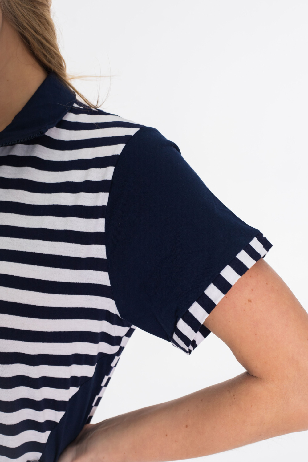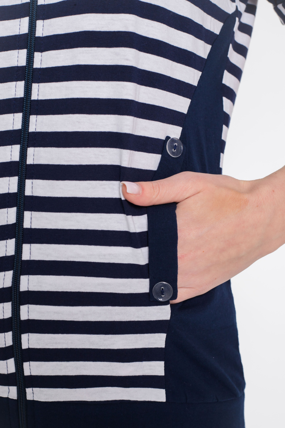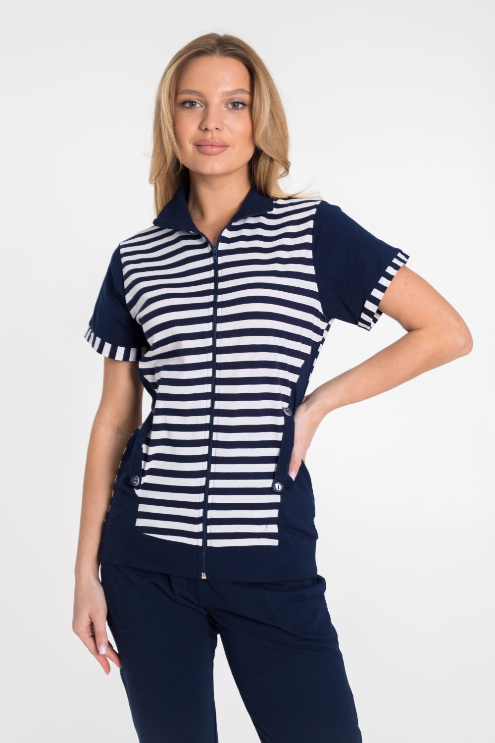 Женский костюм выполнен из хлопкового полотна. Удлинённая футболка с высоким воротником спереди застёгивается на молнию. Украшена вставками из полотна в полоску и боковыми карманами. Капри прямого покроя с накладными карманами, по бокам стягиваются при помощи шнурков.