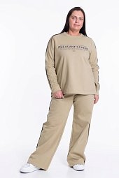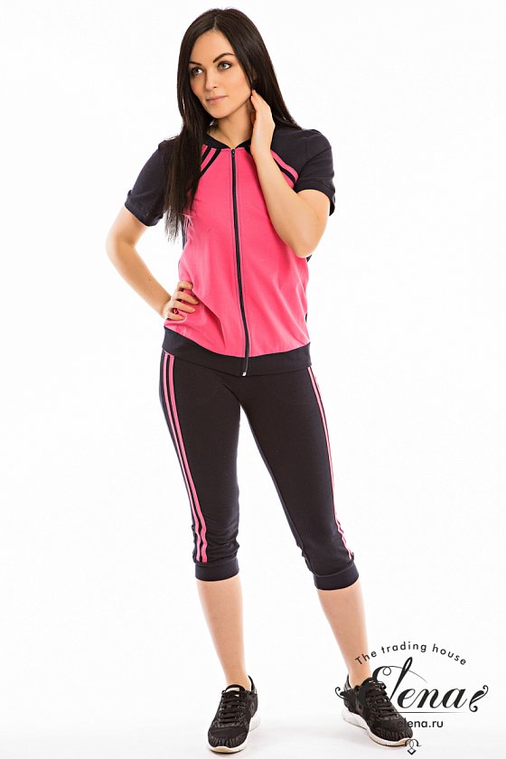 Костюм выполнен из кулирки с лайкрой, кофта с коротким рукавом и застёжкой на молнию. Бриджи с поясом на резинке, карманами и манжетами внизу. На кофте и брюках в качестве отделки настрочены лампасы.