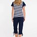 Женский костюм выполнен из хлопкового полотна. Удлинённая футболка с высоким воротником спереди застёгивается на молнию. Украшена вставками из полотна в полоску и боковыми карманами. Капри прямого покроя с накладными карманами, по бокам стягиваются при помощи шнурков.