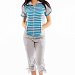 Женский костюм выполнен из хлопкового полотна. Удлинённая футболка с высоким воротником спереди застёгивается на молнию. Украшена вставками из полотна в полоску и боковыми карманами. Капри прямого покроя с накладными карманами, по бокам стягиваются при помощи шнурков.