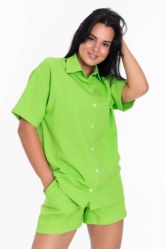 Рубашка свободного кроя с воротником-стойкой и спущенным рукавом длиной до локтя застёгивается на пуговицы спереди, на левой полочке есть карман.