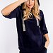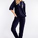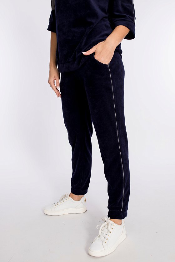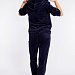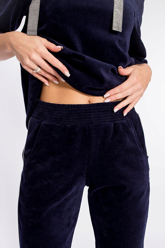 Женский костюм выполнен из велюра. Толстовка с капюшоном, рукавами реглан длиной 3/4, с отделочным кантом. Брюки длинные, с карманами и кантом в боковых швах. Пояс брюк на резине, низ с манжетами.