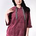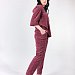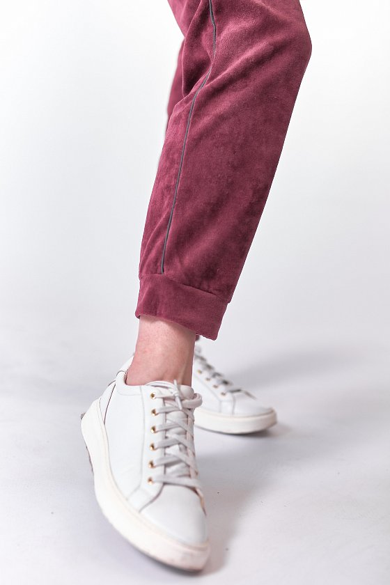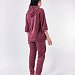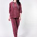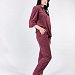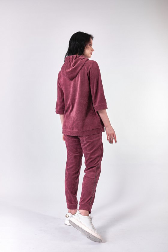 Женский костюм выполнен из велюра. Толстовка с капюшоном, рукавами реглан длиной 3/4, с отделочным кантом. Брюки длинные, с карманами и кантом в боковых швах. Пояс брюк на резине, низ с манжетами.