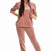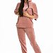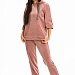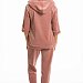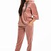 Женский костюм выполнен из велюра. Толстовка с капюшоном, рукавами реглан длиной 3/4, с отделочным кантом. Брюки длинные, с карманами и кантом в боковых швах. Пояс брюк на резине, низ с манжетами.