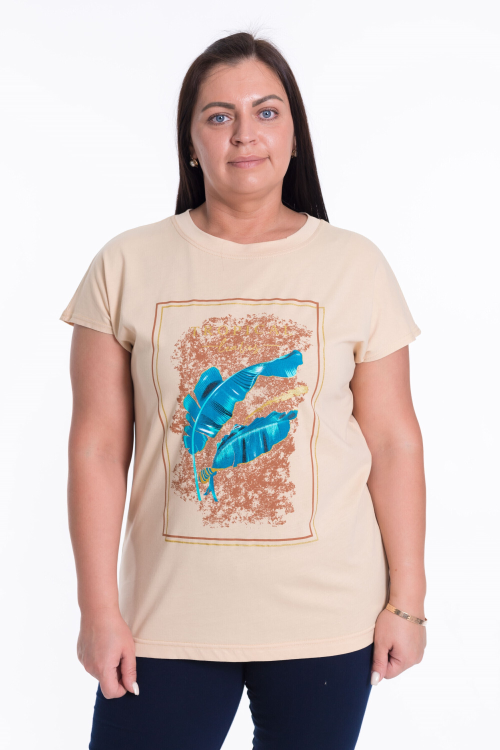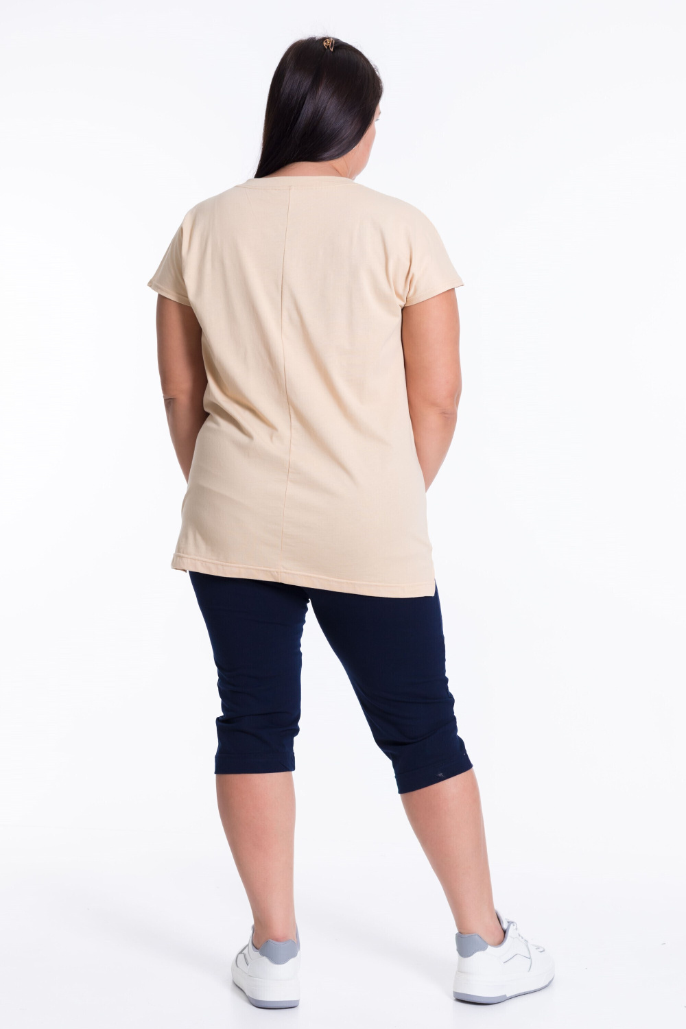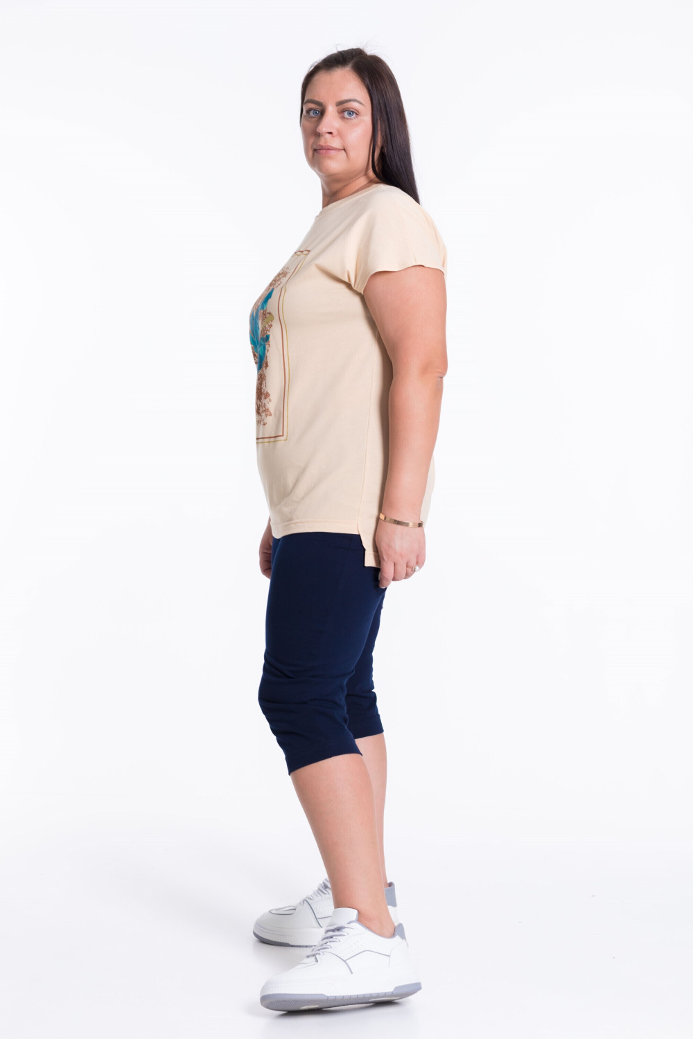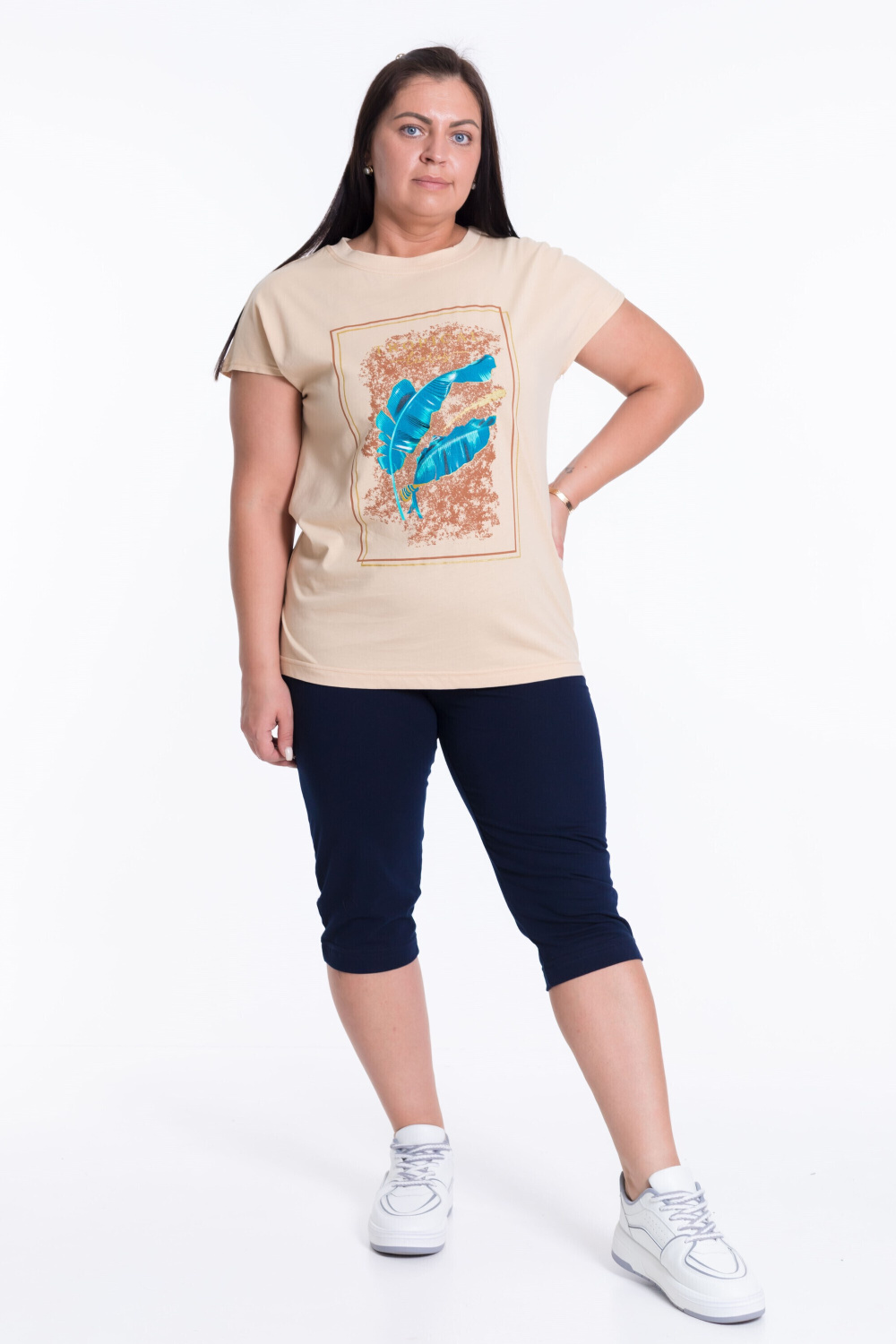 Женский костюм из кулирки — отличный выбор для повседневной носки. Футболка с круглым вырезом и спущенными рукавами украшена принтом на полочке. Однотонные капри обеспечивают свободу движений и комфорт. Изготовленный из натуральной ткани, костюм обеспечит комфорт в течение всего дня.