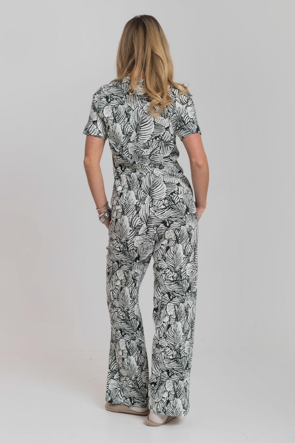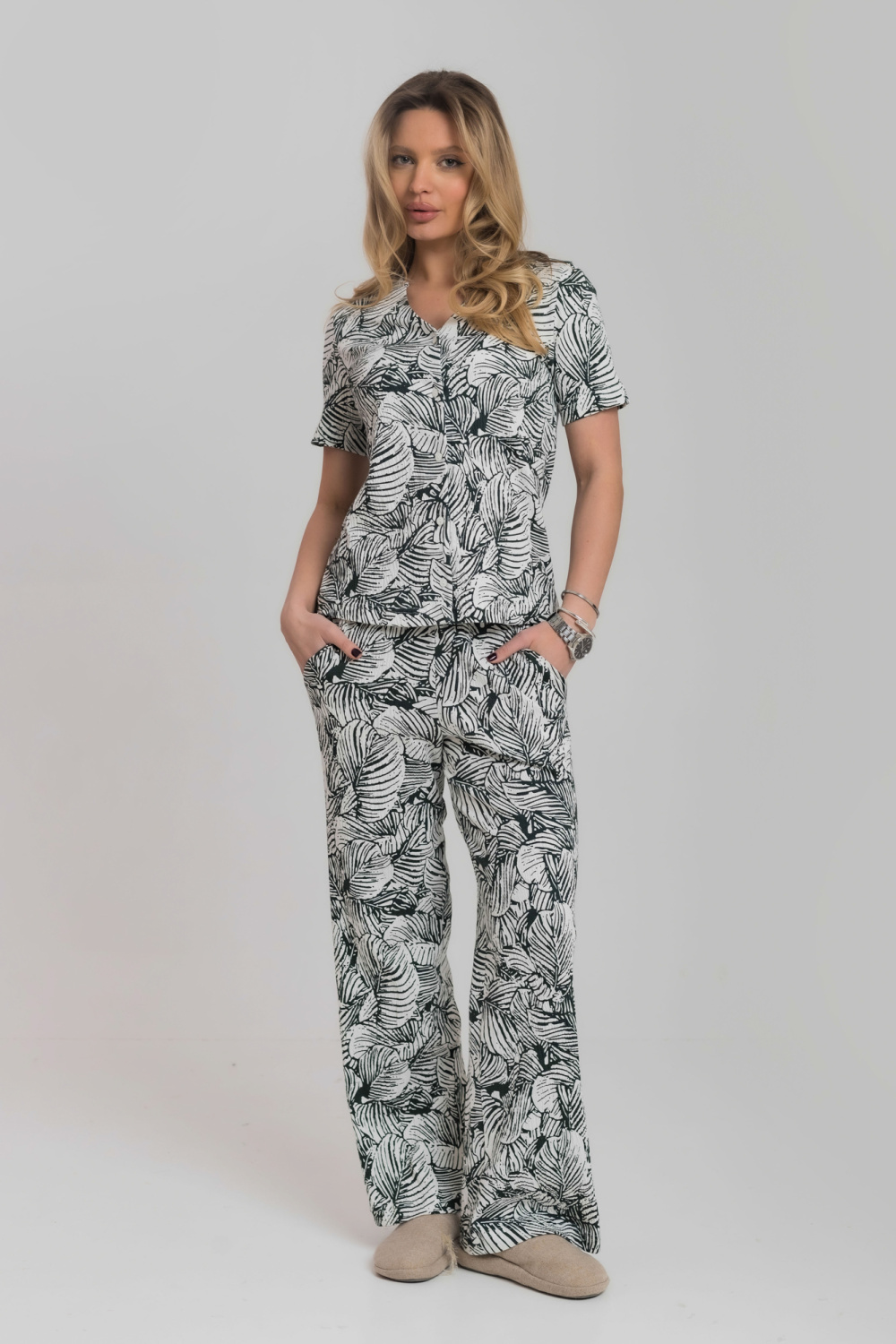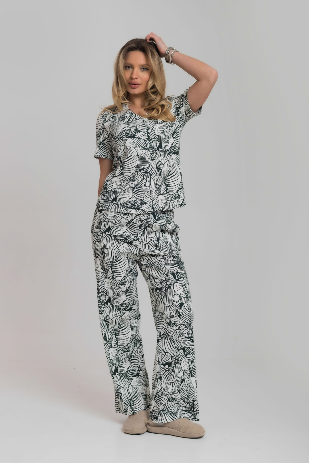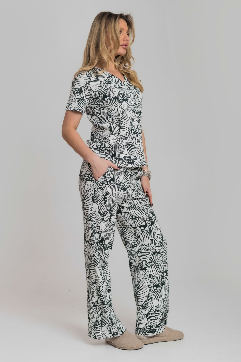 Брюки свободные, с цельнокроенным поясом на резине и карманами по бокам.