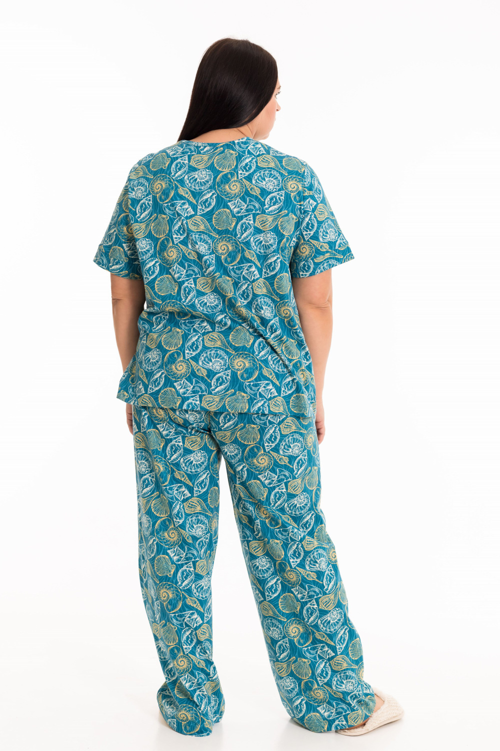 Костюм выполнен из х/б полотна с набивным рисунком. Костюм состоит из футболки с коротким рукавом и широких брюк. Горловина футболки оформлена бейкой, в рукавах манжеты. Силуэт футболки расклешенный. Брюки с карманами по бокам и поясом на резинке.