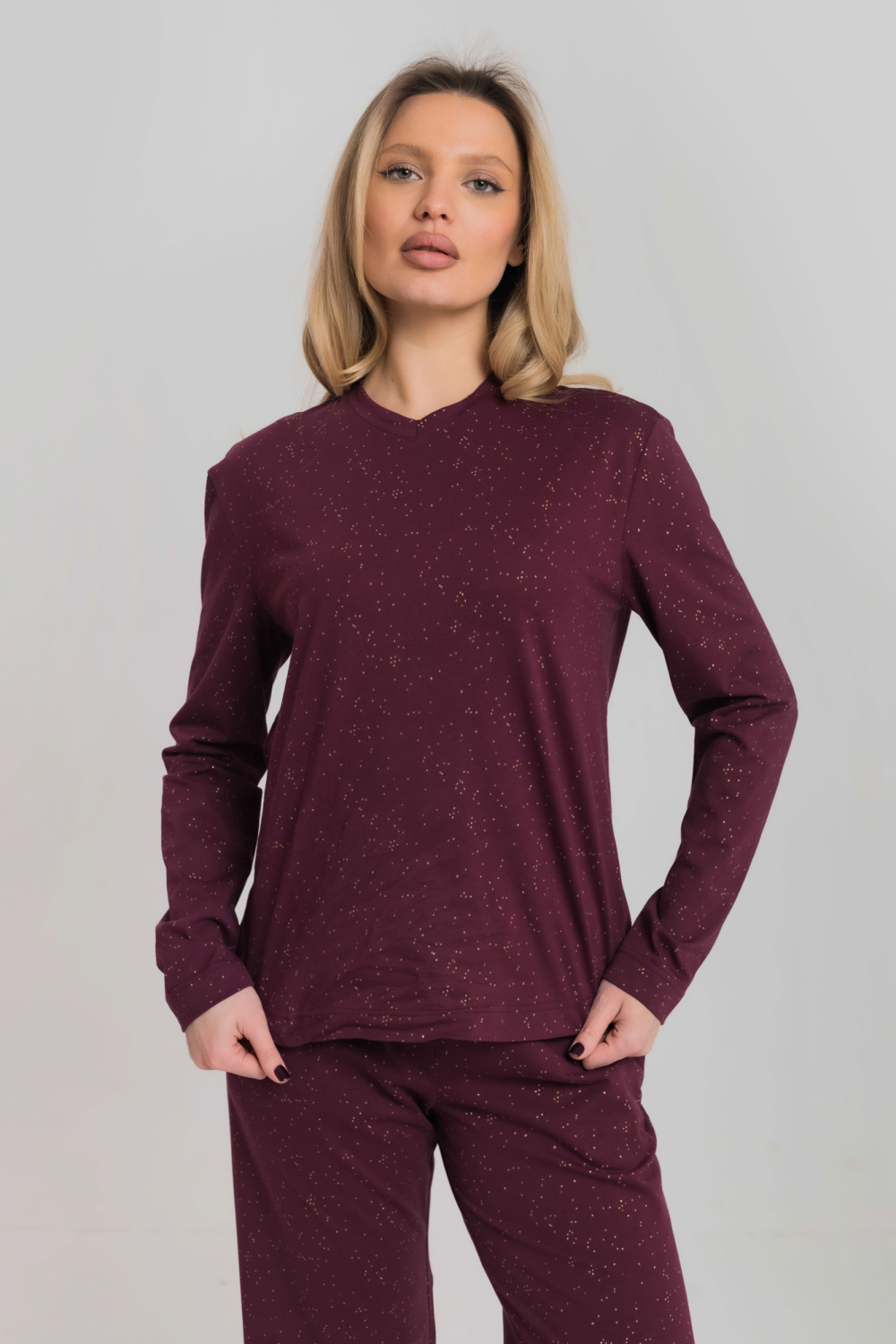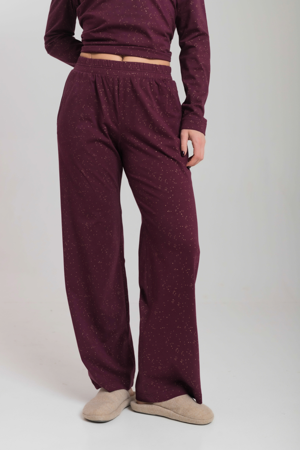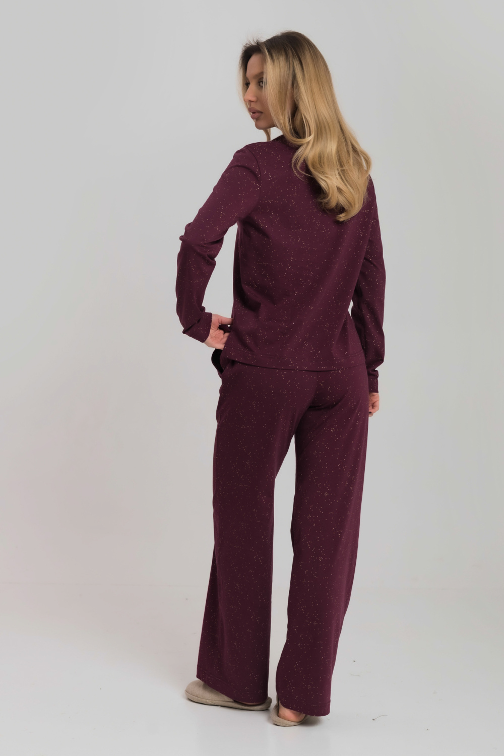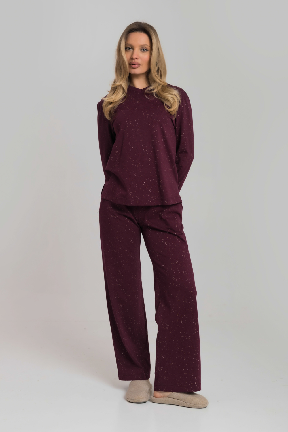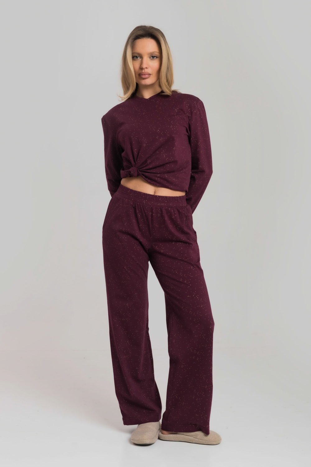 Уютный и стильный домашний костюм, состоит из лонгслива с элегантным V-образным вырезом и комфортных брюк. Мягкая кулирка с деликатным глиттером обеспечивает приятные ощущения на коже и аккуратный блеск. Брюки выполнены с притачным поясом и удобными боковыми карманами, имеют прямой свободный крой, который не стесняет движений. Идеальный выбор для домашнего отдыха и повседневных дел.