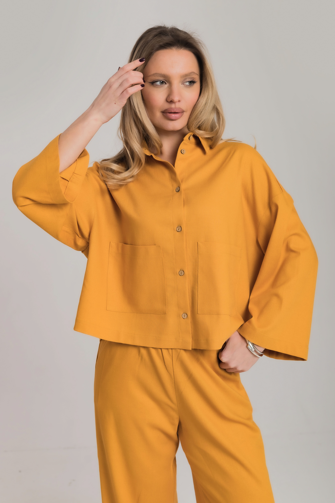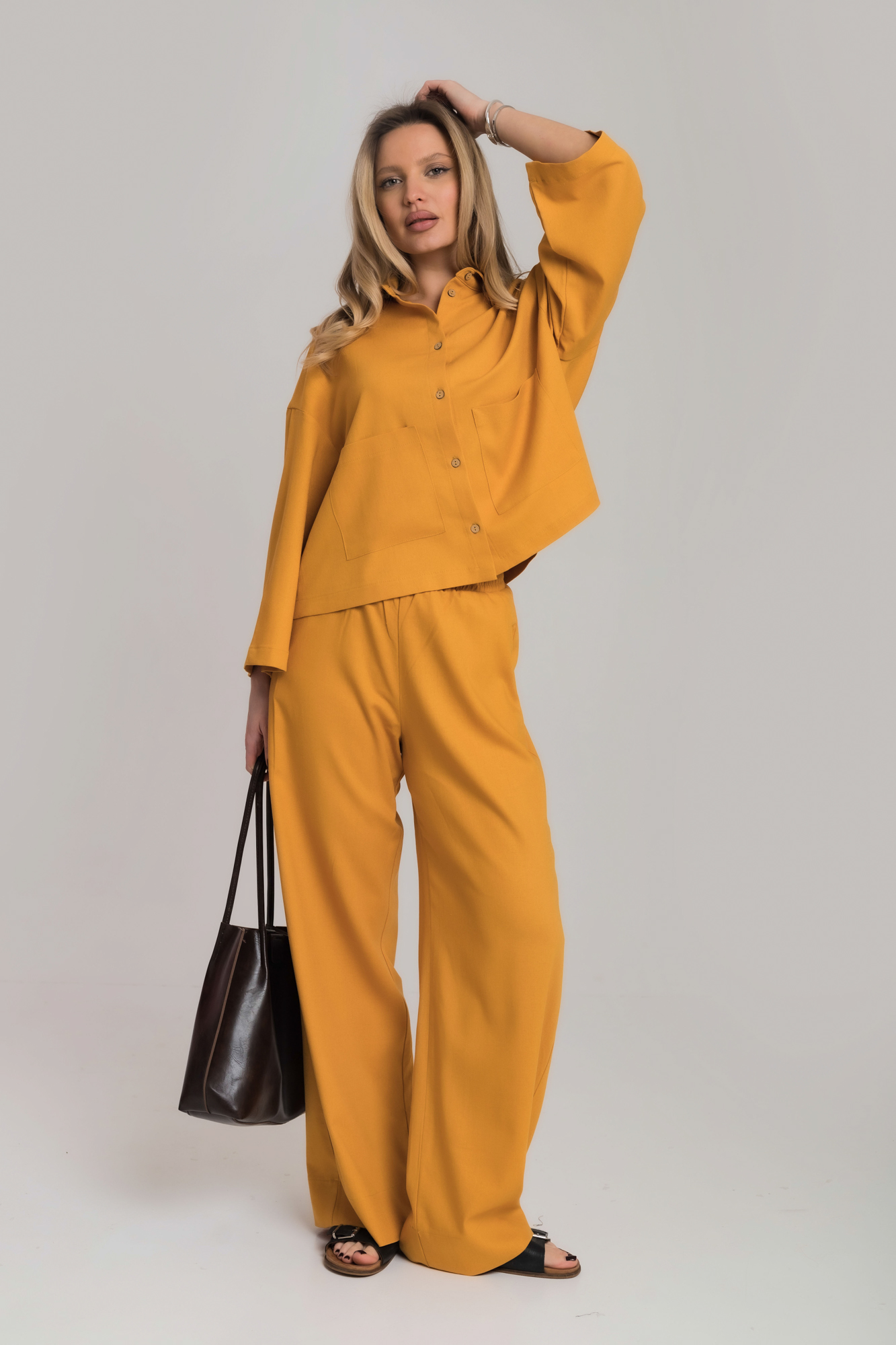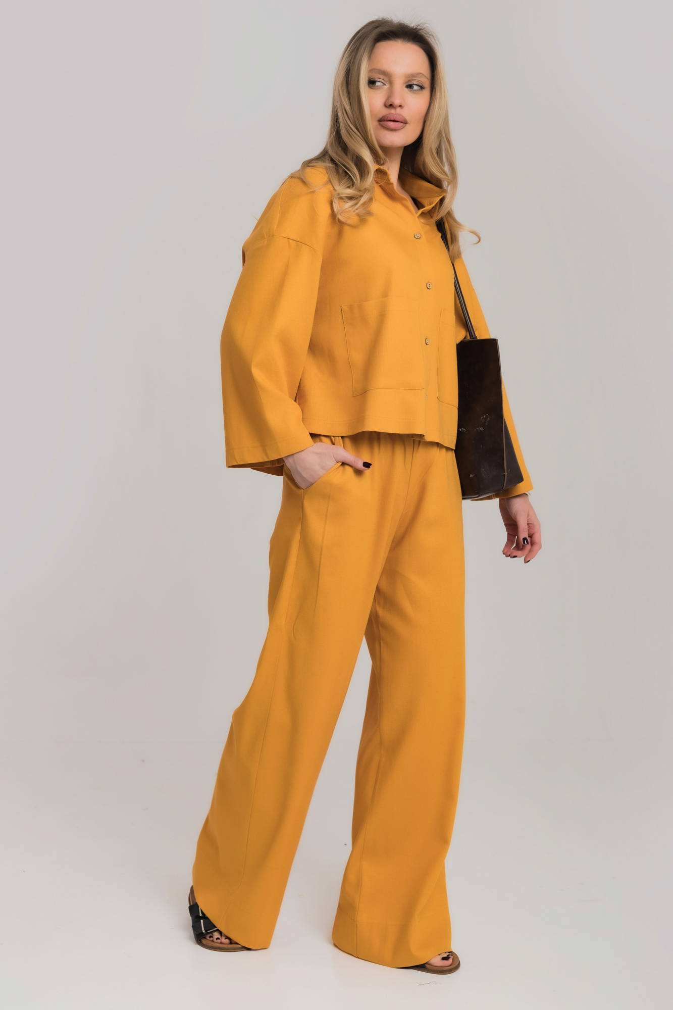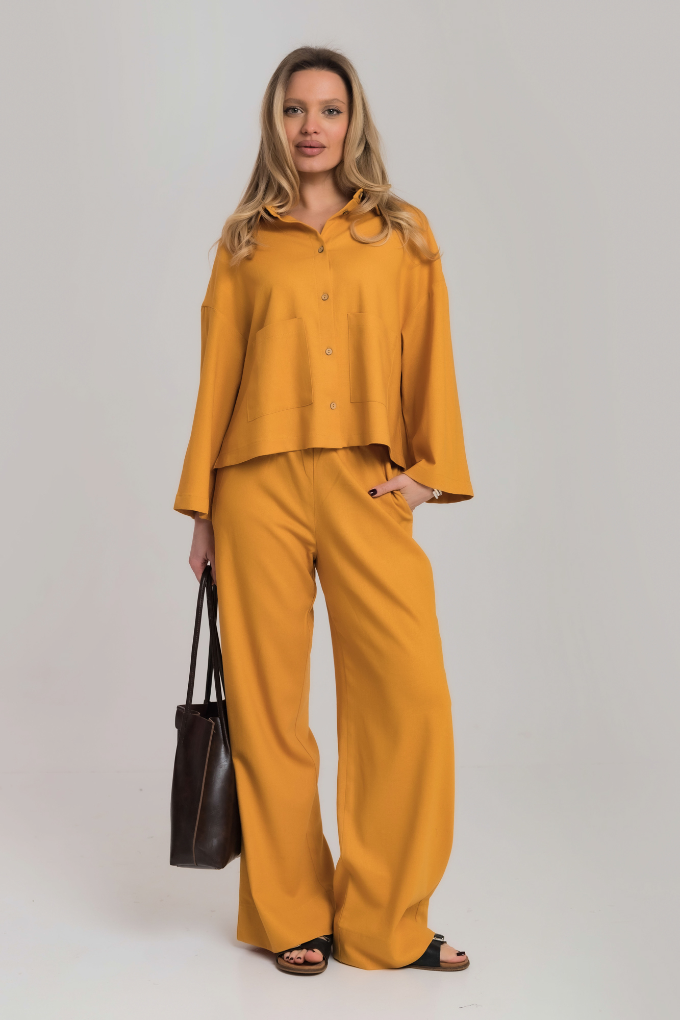 Костюм свободного силуэта сшит изо льна с вискозой.