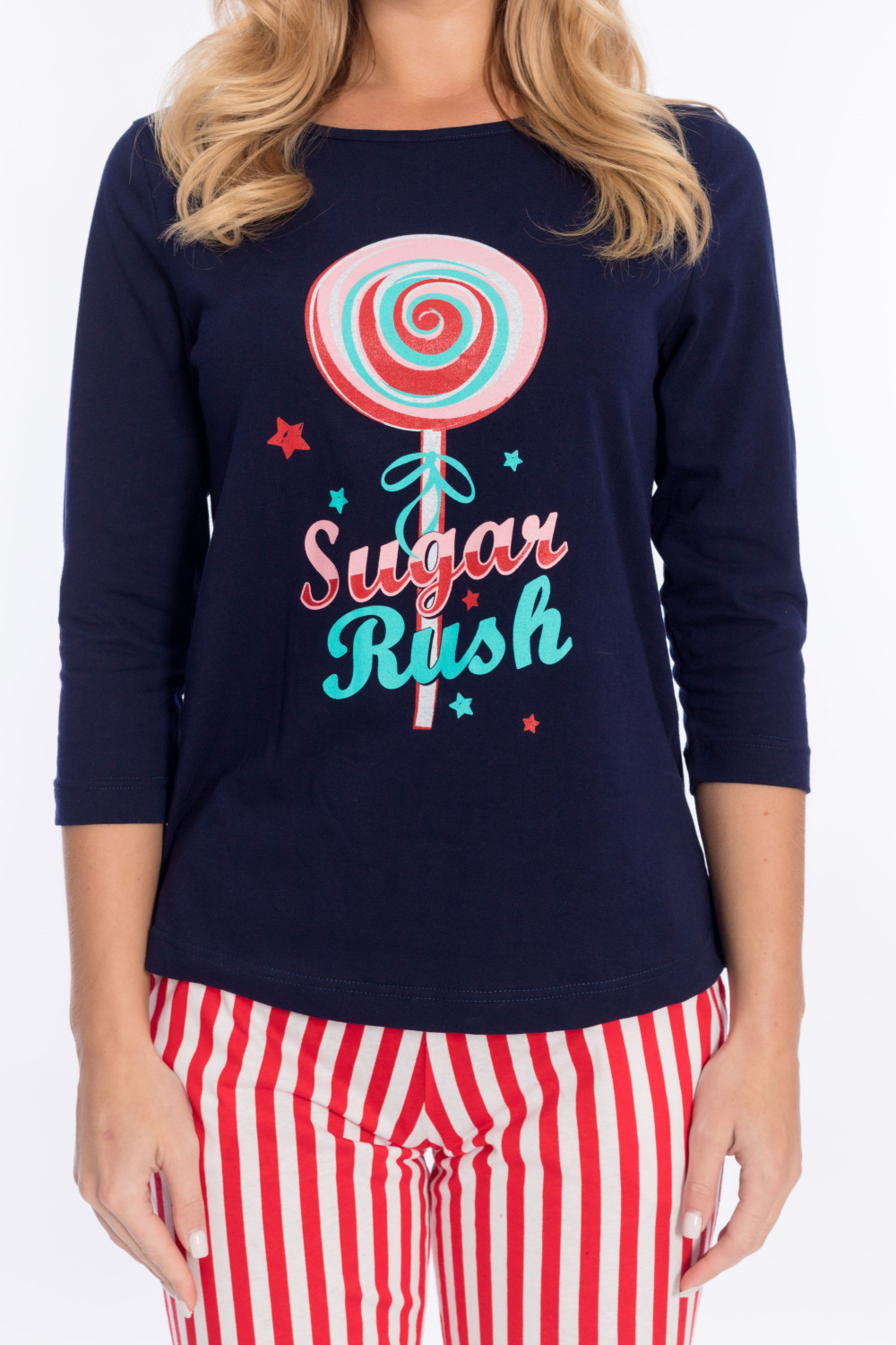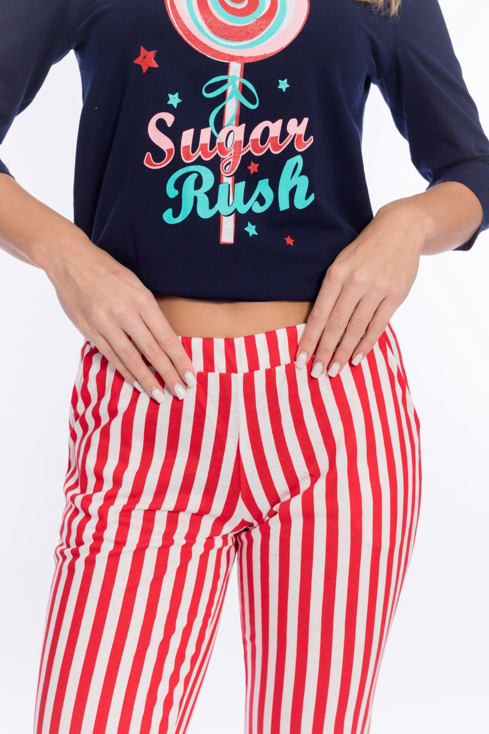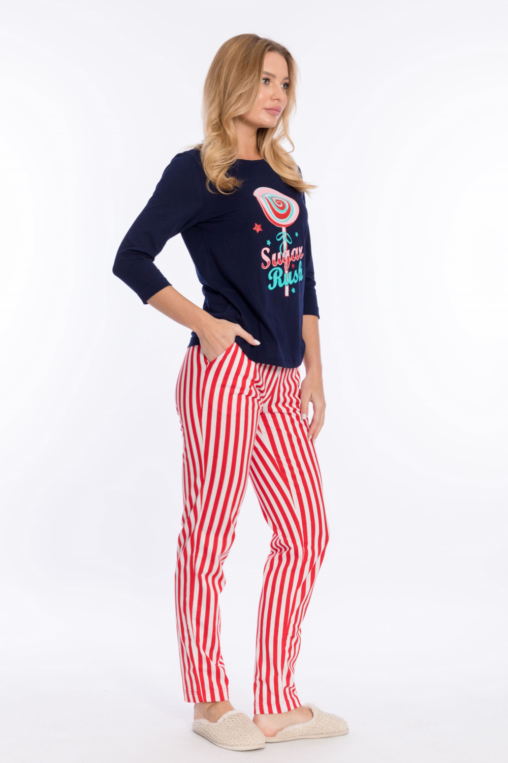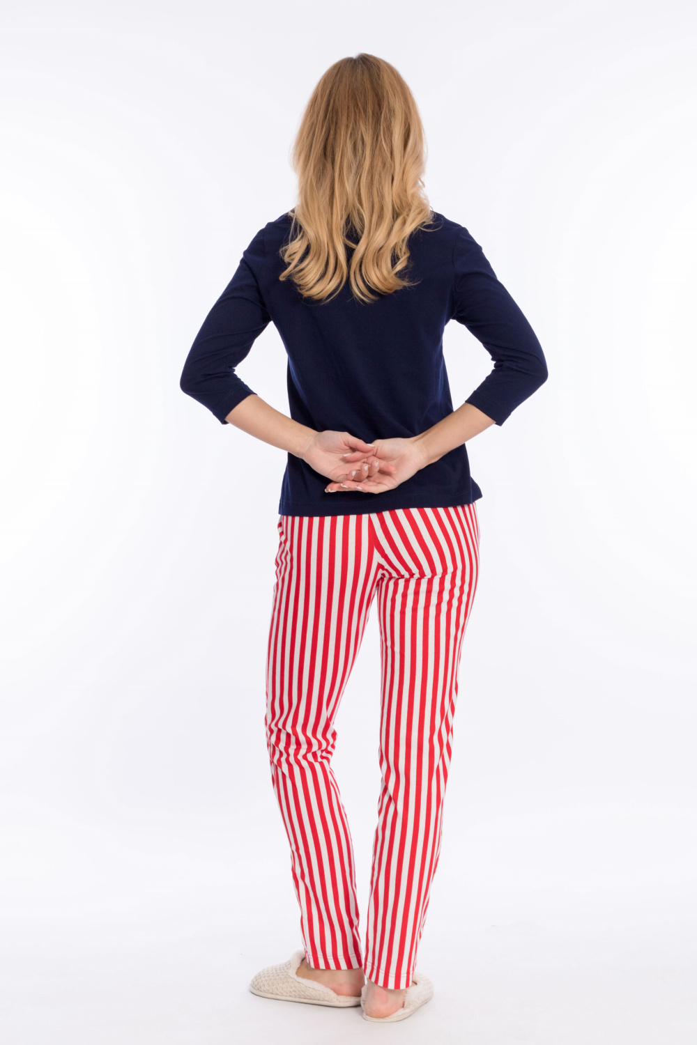 Костюм выполнен из кулирки, 100% хлопок. Состоит из однотонной футболки с рукавом 3/4 и брюк в полоску. На футболке спереди нанесён принт. Брюки с боковыми карманами и поясом на резинке.