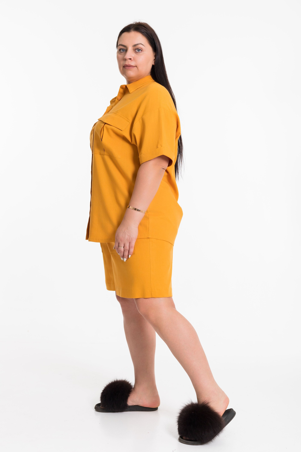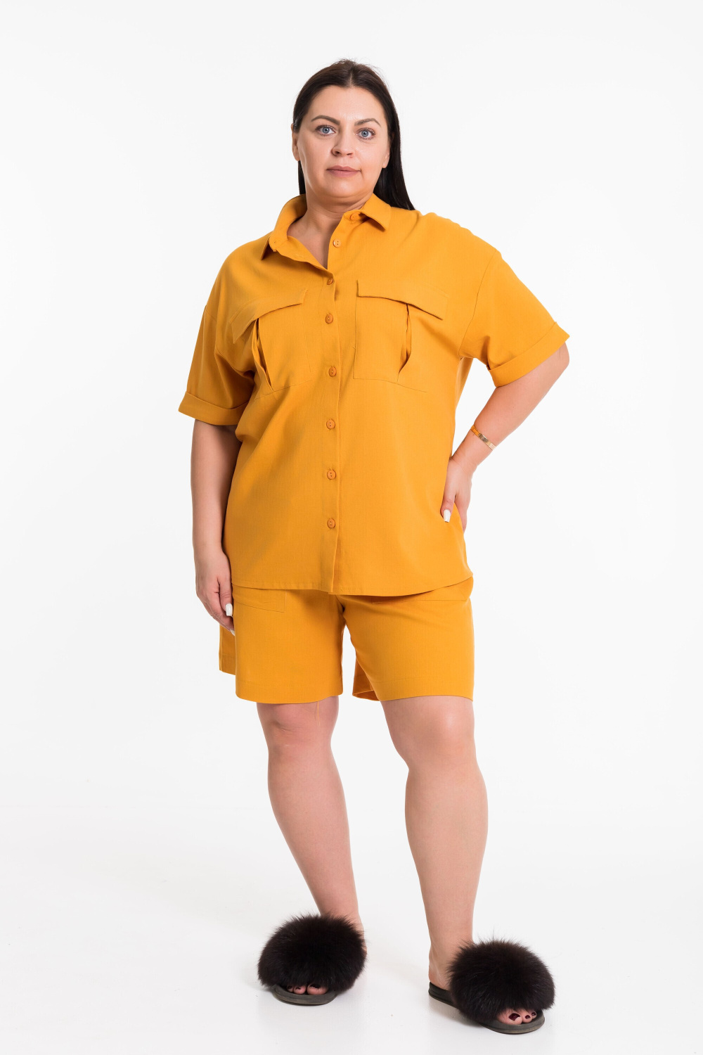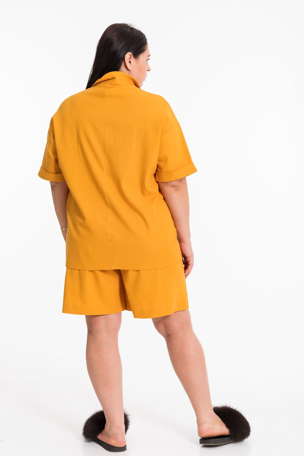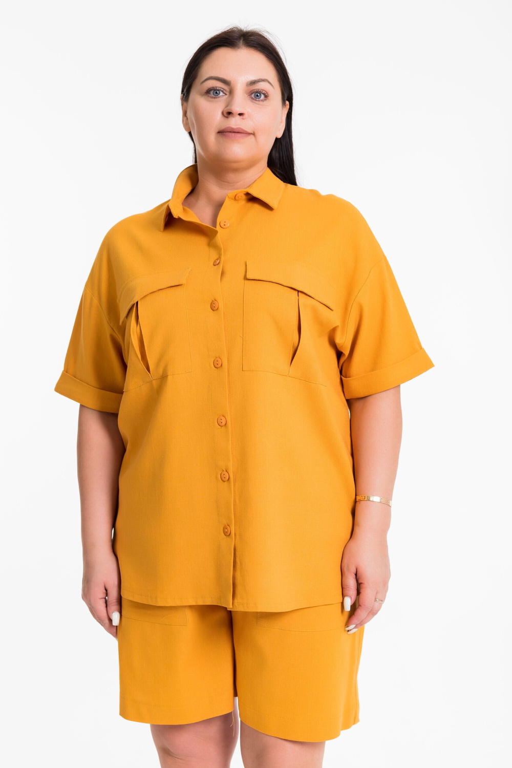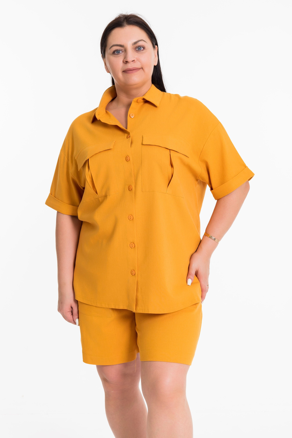 Костюм выполнен из натурального льна с вискозой, состоит из шорт и рубашки. Шорты выше колена с накладными карманами спереди и притачным поясом. Рубашка с коротким рубашечным рукавом с притачной манжетой. Рубашка с застежкой на пуговицы и воротником на отрезной стойке, спереди накладные карманы с клапанами.