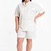 Костюм выполнен из натурального льна с вискозой, состоит из шорт и рубашки. Шорты выше колена с накладными карманами спереди и притачным поясом. Рубашка с коротким рубашечным рукавом с притачной манжетой. Рубашка с застежкой на пуговицы и воротником на отрезной стойке, спереди накладные карманы с клапанами.