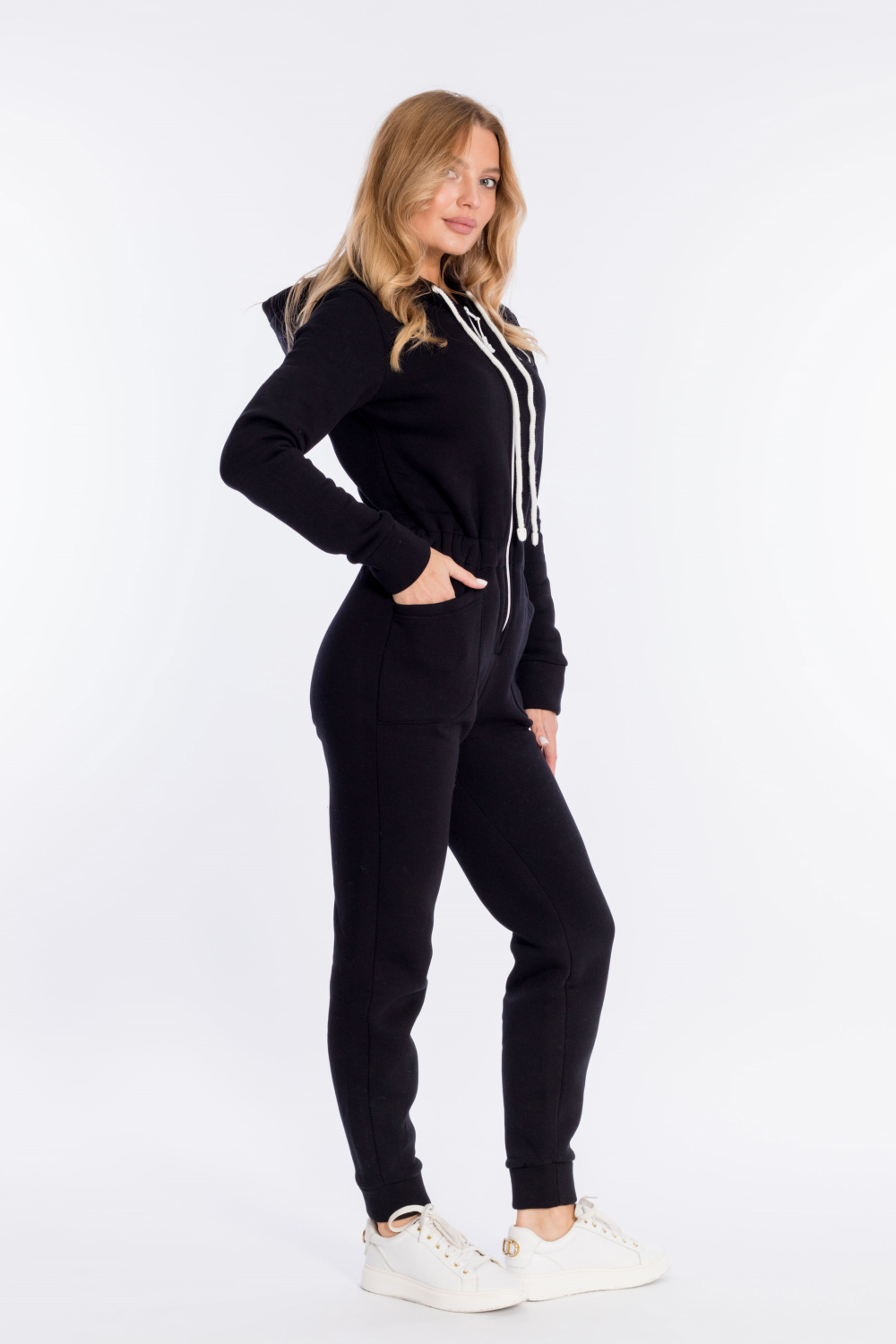 Комбинезон из однотонного футера с начёсом. С капюшоном, застёжкой на молнию и накладными карманами спереди. По талии кулиска с резинкой. Рукава и низ брюк с притачными манжетами. С левой стороны вышивка.
