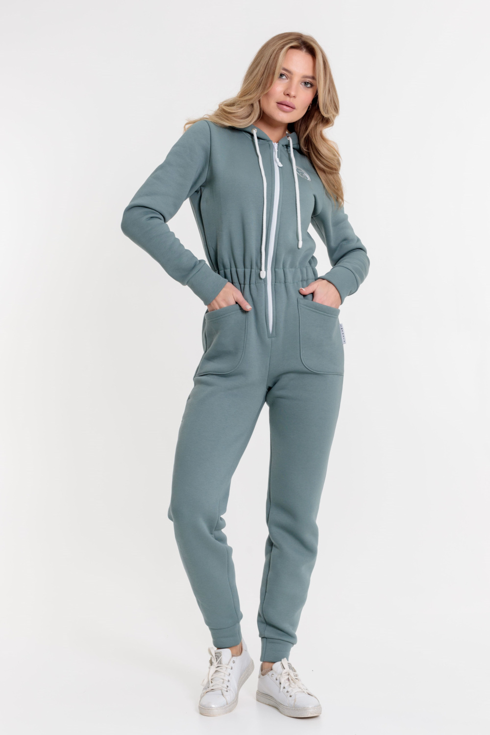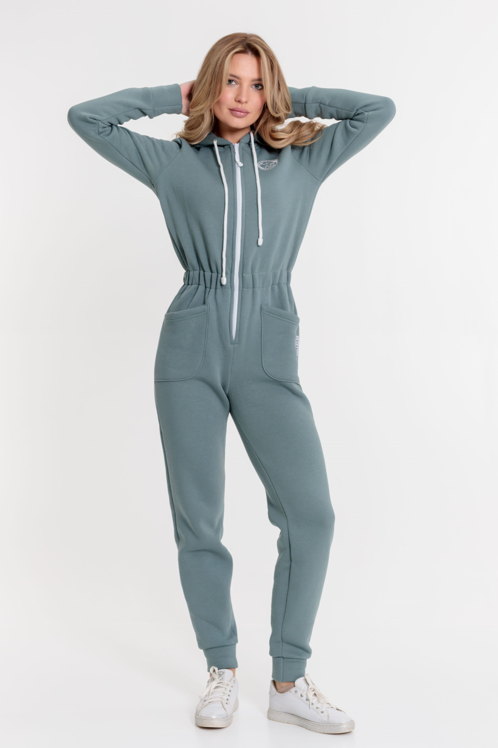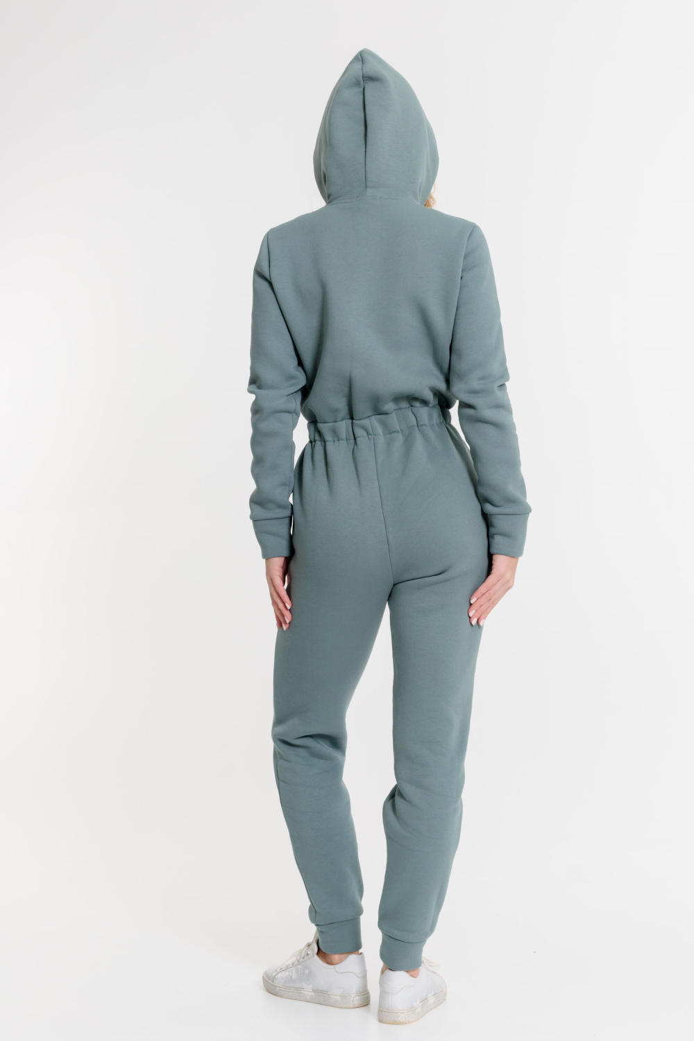 Комбинезон из однотонного футера с начёсом. С капюшоном, застёжкой на молнию и накладными карманами спереди. По талии кулиска с резинкой. Рукава и низ брюк с притачными манжетами. С левой стороны вышивка.