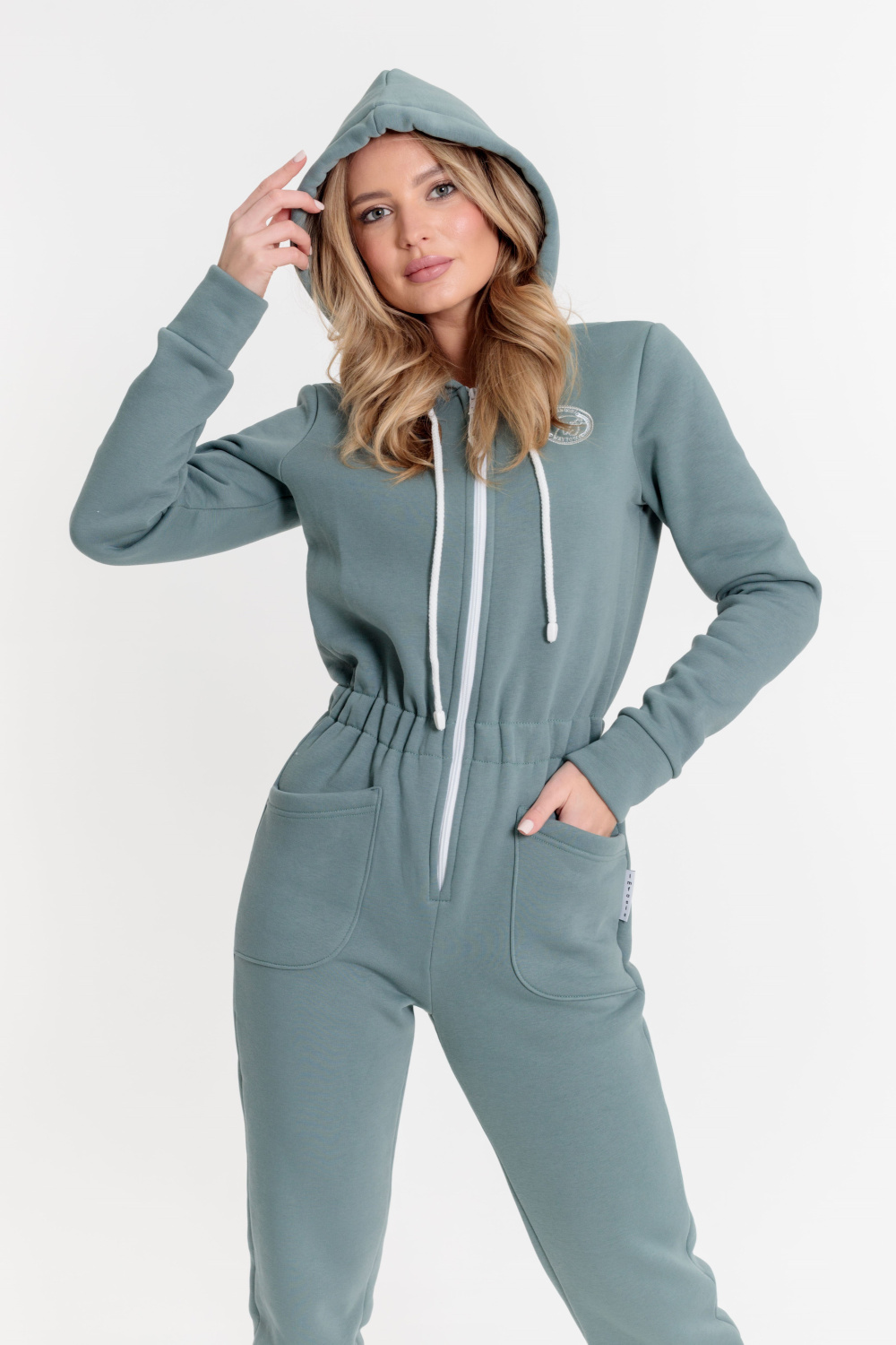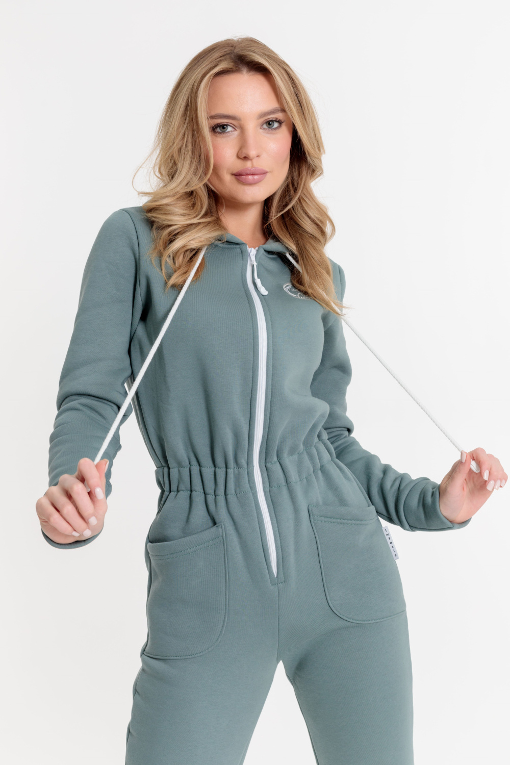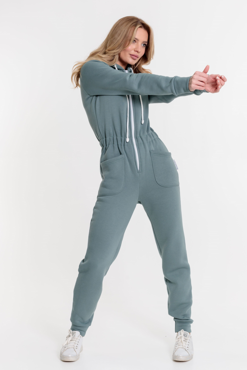 Комбинезон из однотонного футера с начёсом. С капюшоном, застёжкой на молнию и накладными карманами спереди. По талии кулиска с резинкой. Рукава и низ брюк с притачными манжетами. С левой стороны вышивка.