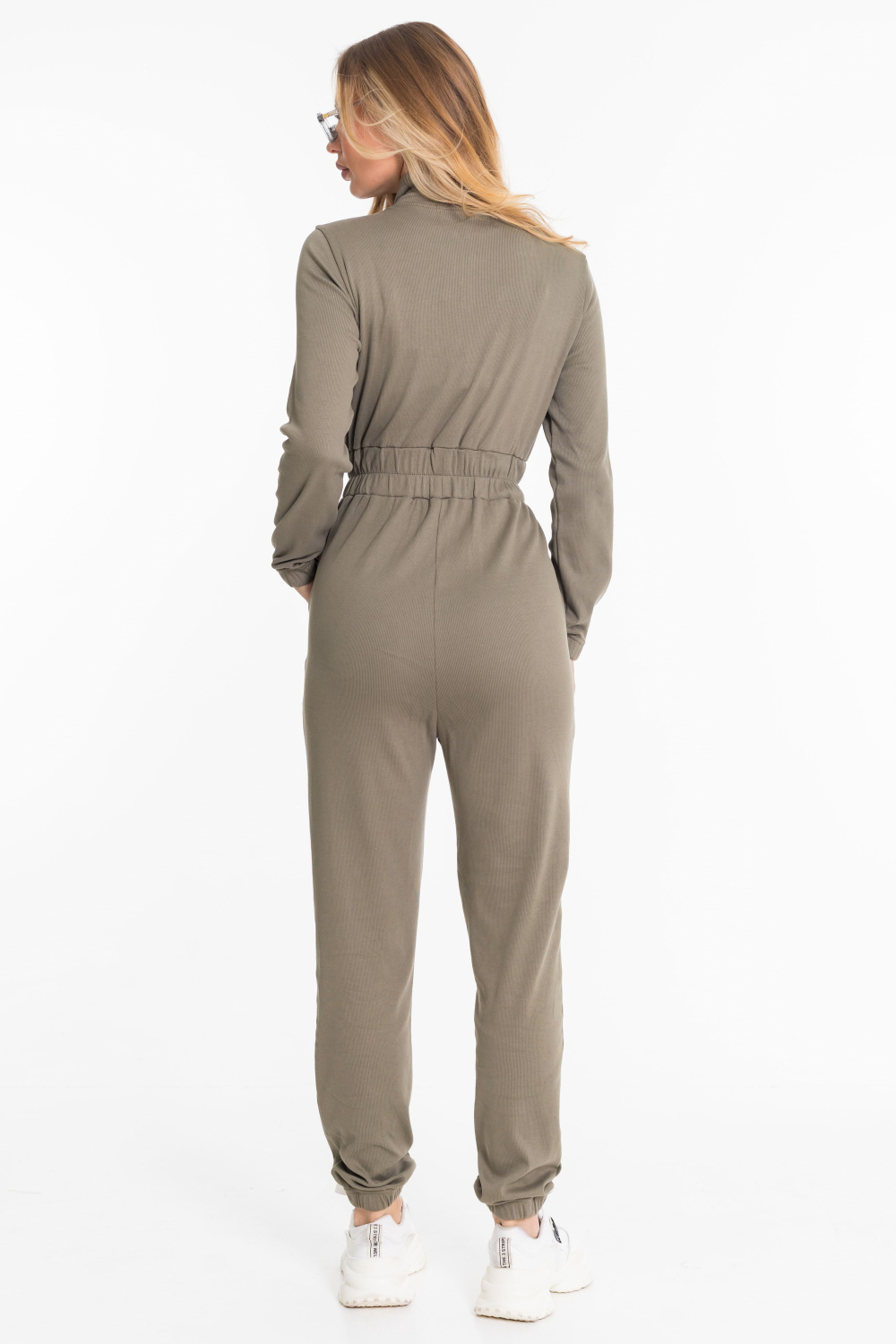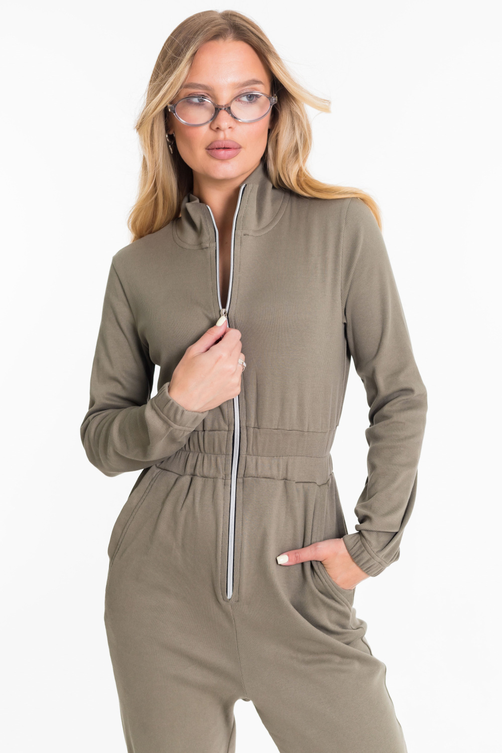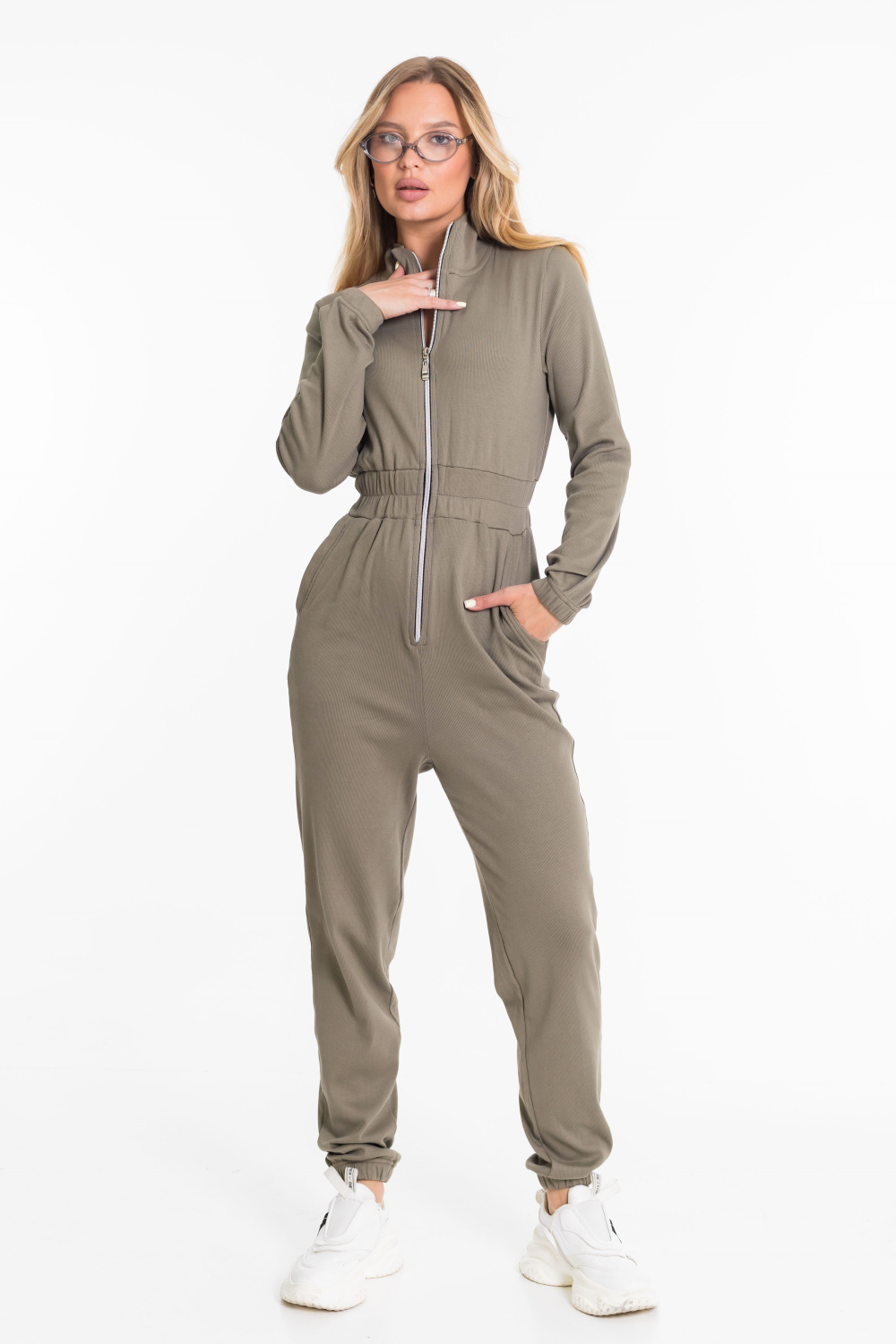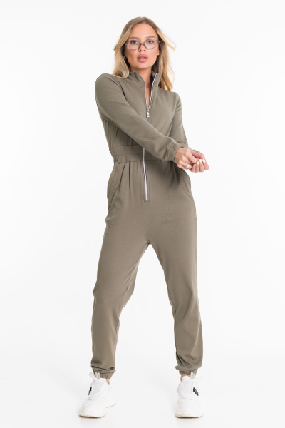 Женский комбинезон из однотонной рибаны с начёсом выполнен в лаконичном и удобном дизайне. Модель имеет застёжку-молнию спереди, воротник-стойку и длинные втачные рукава на резинке по низу. В области талии расположен широкий пояс на резинке, который обеспечивает комфортную посадку и подчёркивает силуэт. На передних половинках предусмотрены боковые карманы с притачной планкой. Низ брюк также собран на резинку, что делает изделие практичным и удобным для носки в прохладное время года.