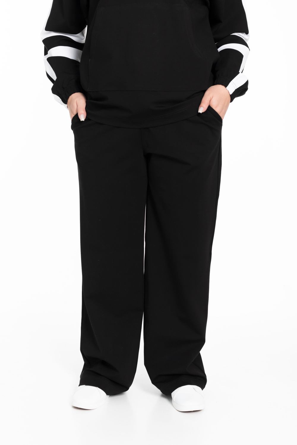Черные брюки чуть расширенного кроя создают модный и удобный образ. Пояс на резинке обеспечивает хорошую посадку и удобство. Боковые карманы делают их удобными для хранения мелочей или просто для удобства.