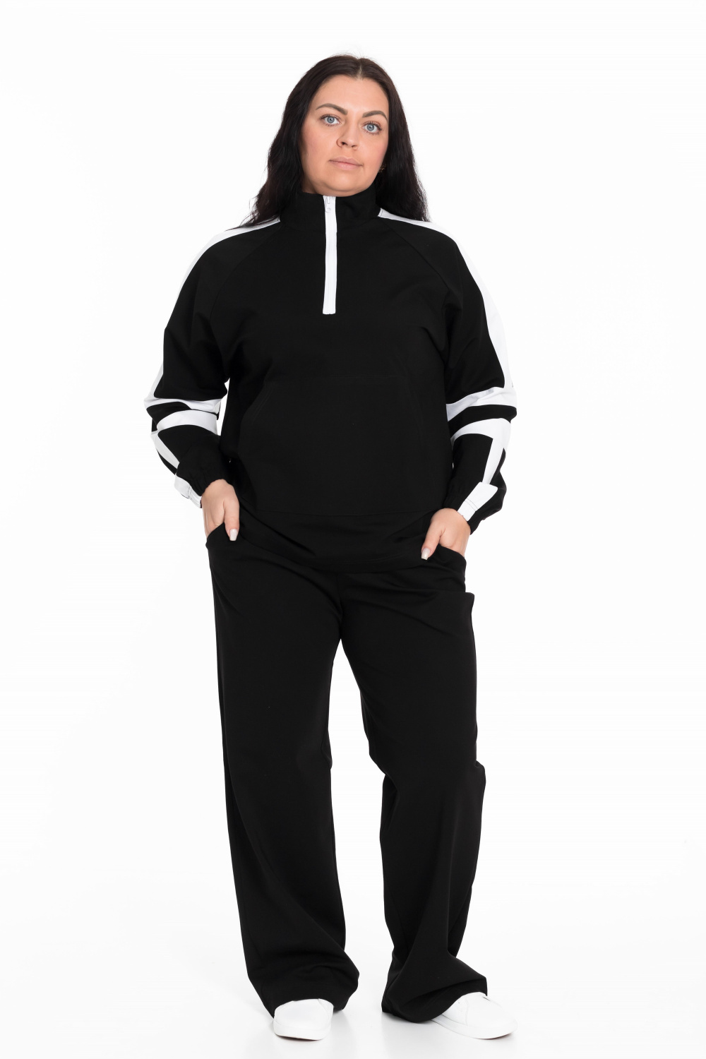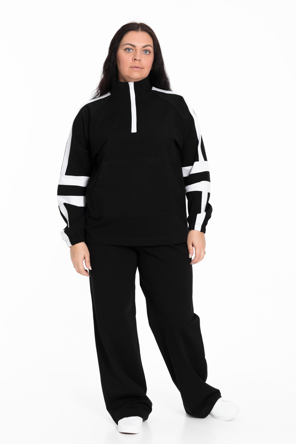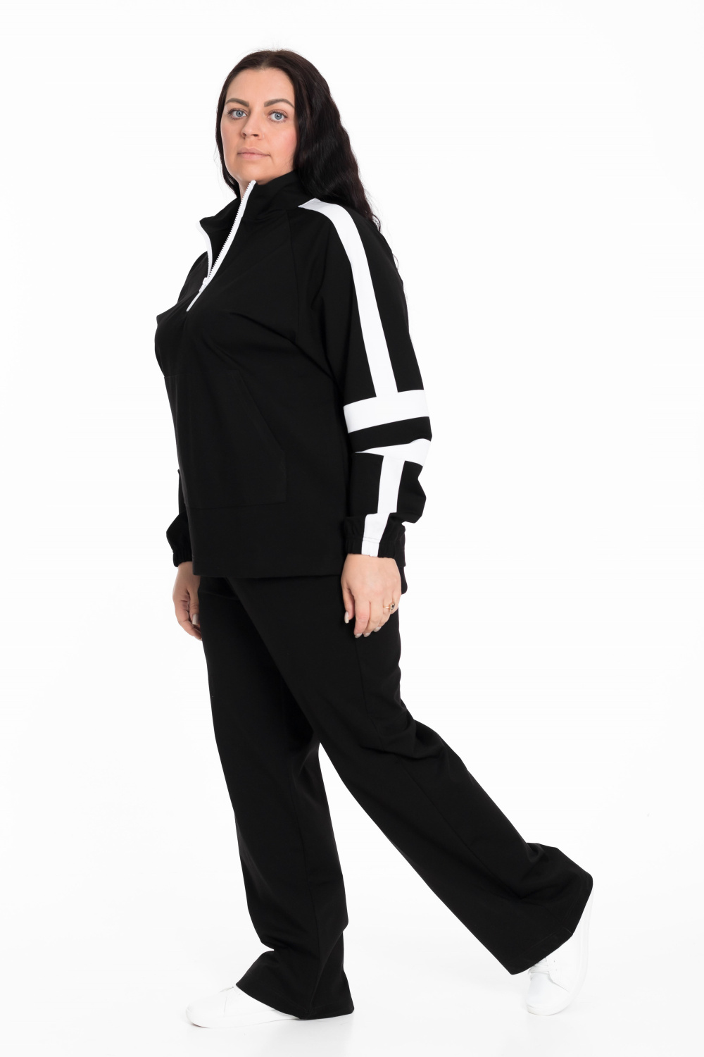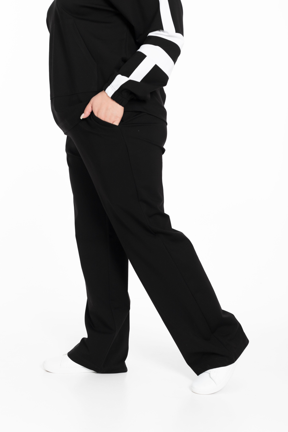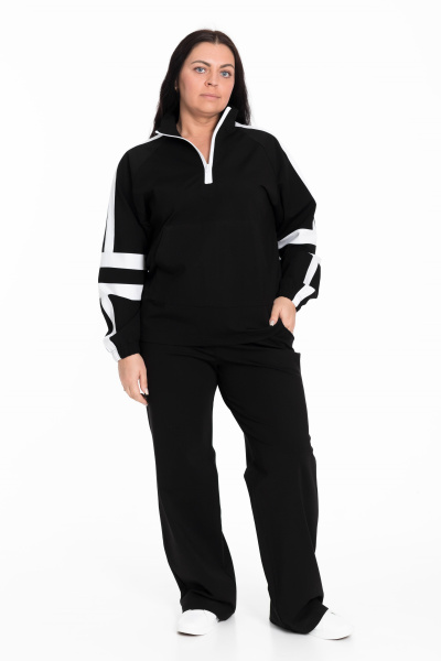 Этот женский костюм представляет собой элегантное и удобное сочетание для повседневной носки или спортивной активности. Черный цвет универсален в сочетании с другой одеждой и аксессуарами.