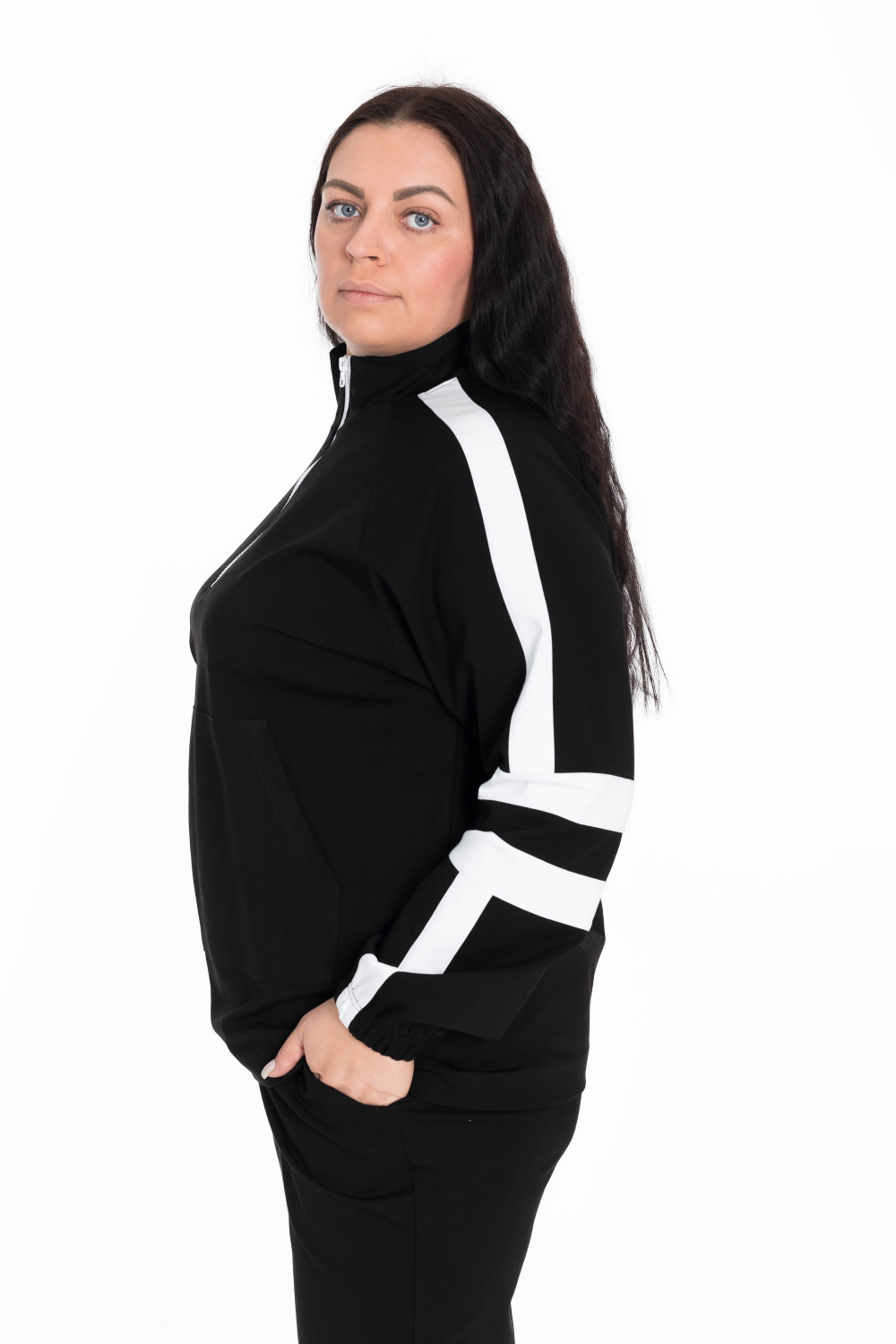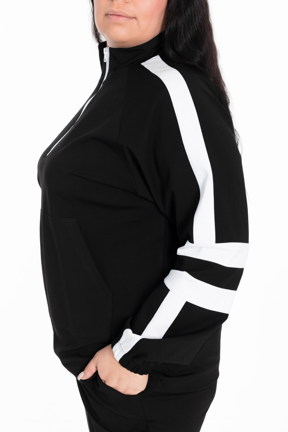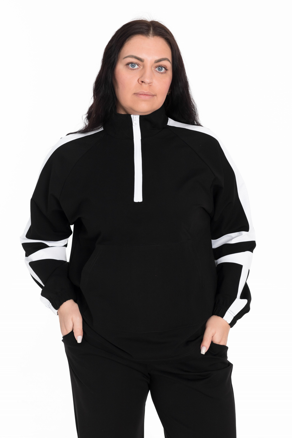 Толстовка из черного академика имеет воротник-стойку с короткой застежкой белого цвета, что добавляет контраст и стиль. Длинные рукава-реглан обеспечивают комфорт и свободу движения, а карман-кенгуру придает уют и функциональность. Отделочные полосы белого цвета на рукавах добавляют интересный дизайн, а манжеты на резинке обеспечивают хорошую посадку и удерживают тепло.