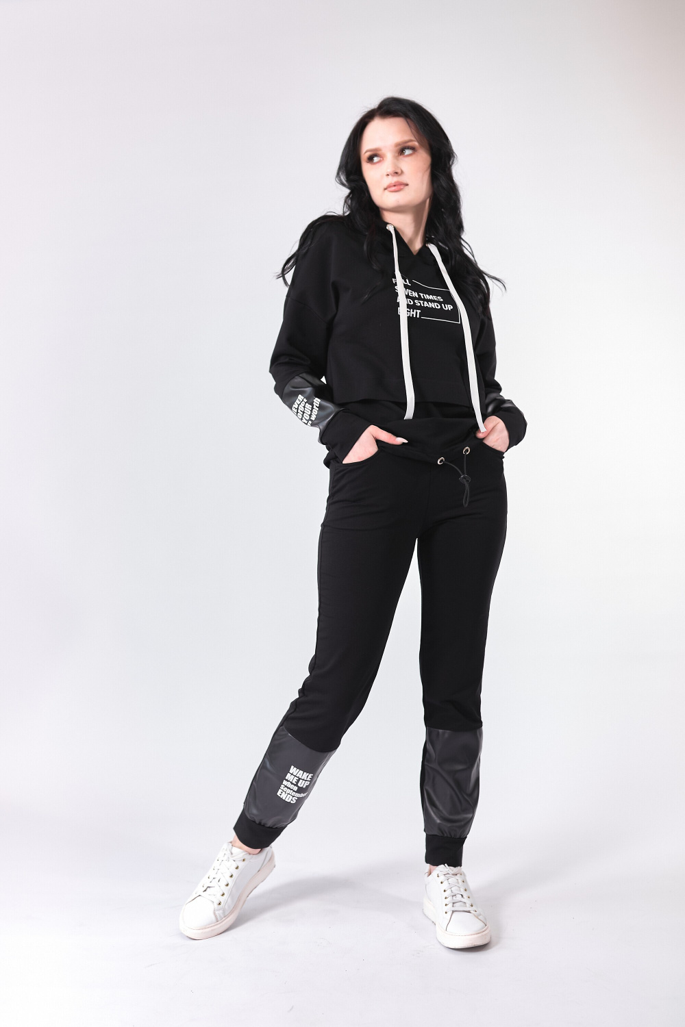 Костюм выполнен из футера с лайкрой чёрного цвета с отделочными деталями из экокожи. Толстовка с капюшоном, втачными рукавами на манжетах и кулиской под резинку по низу изделия. Спереди нанесён принт. Брюки с боковыми и задними карманами, с притачным поясом и манжетами. На вставках из экокожи нанесён термопринт.