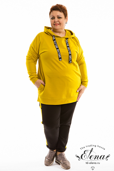 Костюм выполнен из футер петли с лайкрой. Толстовка свободного силуэта, удлинённая, низ на притачном поясе. По бокам с карманами, в капюшоне проложена тесьма. Брюки с отделкой лампасами, пояс на резине и шнуре, низ брюк на манжетах с отворотами.