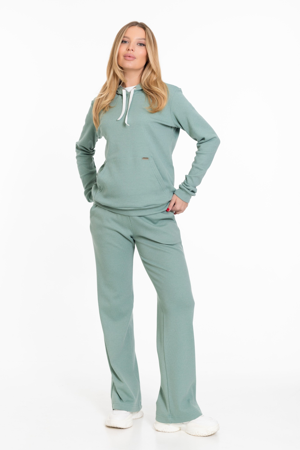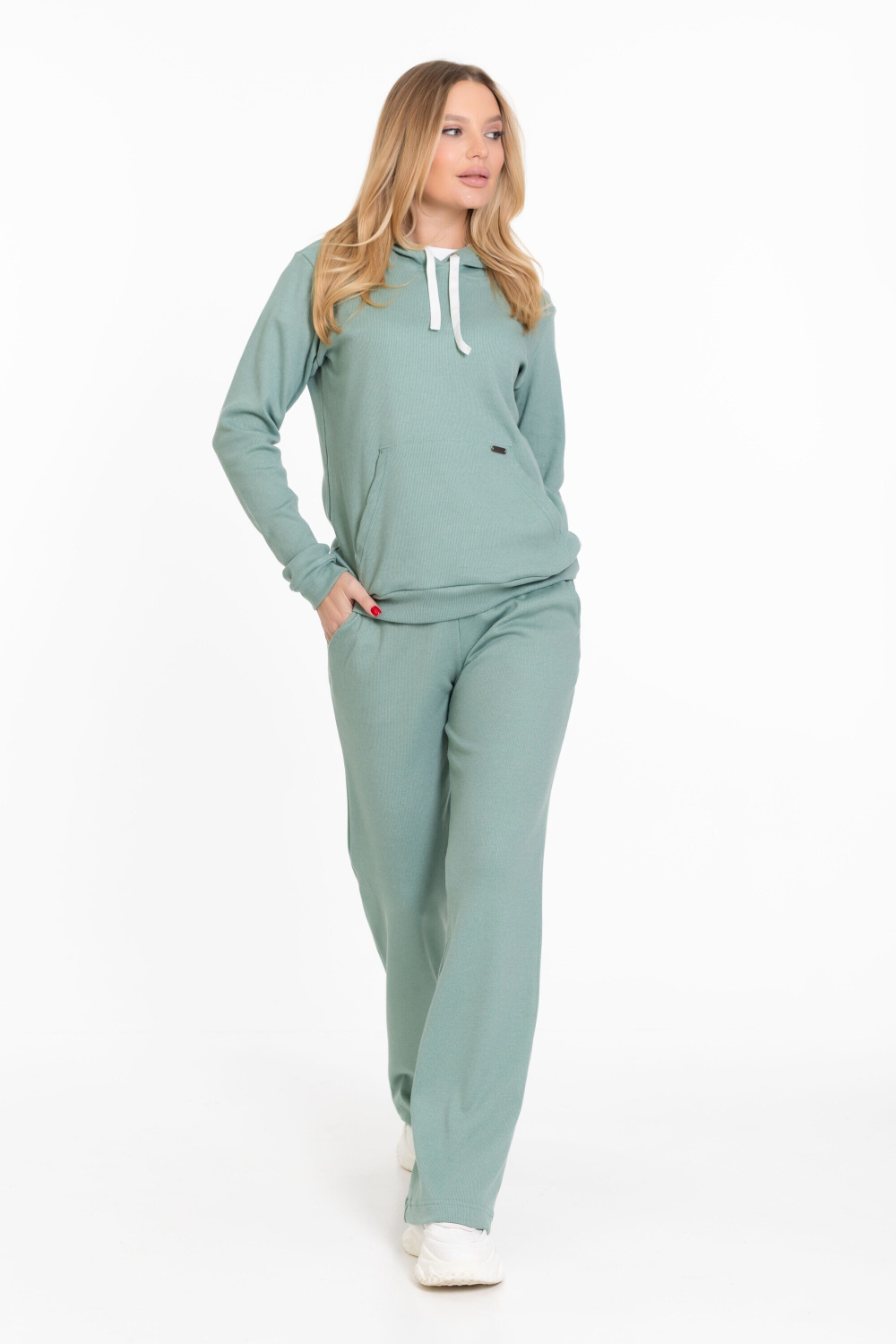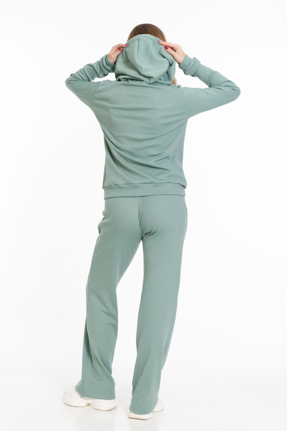 Женский костюм из однотонного кашкорсе цвета ментол с начесом представляет собой уютный и стильный комплект, состоящий из брюк и толстовки.