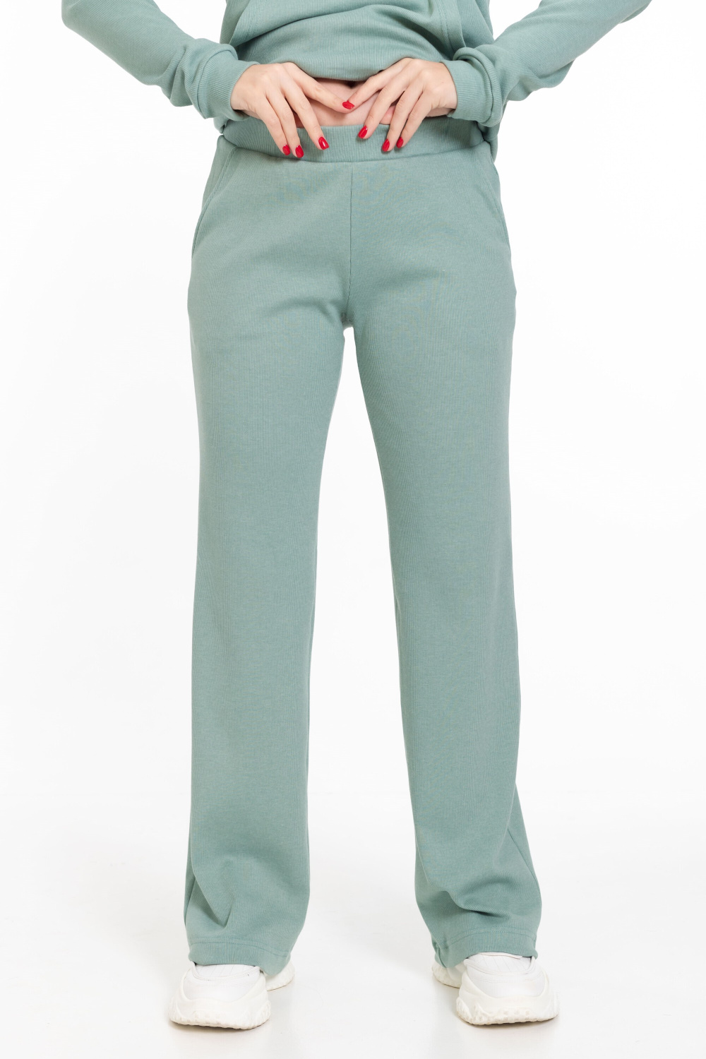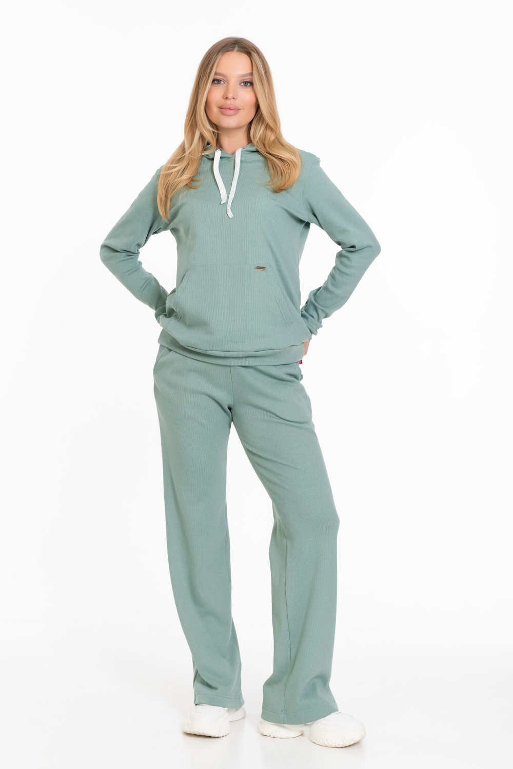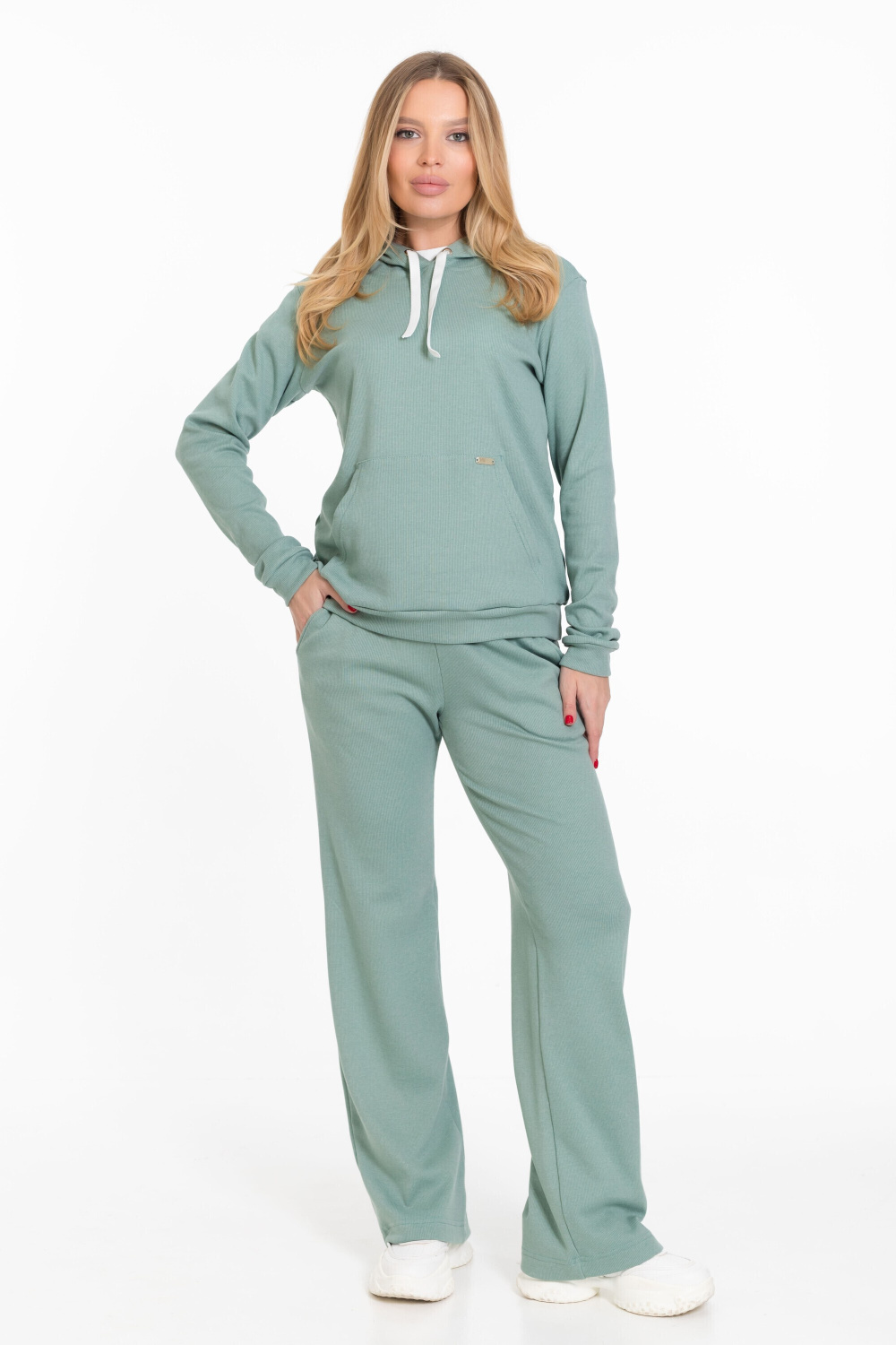 Женский костюм из однотонного кашкорсе цвета ментол с начесом представляет собой уютный и стильный комплект, состоящий из брюк и толстовки.
