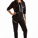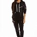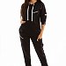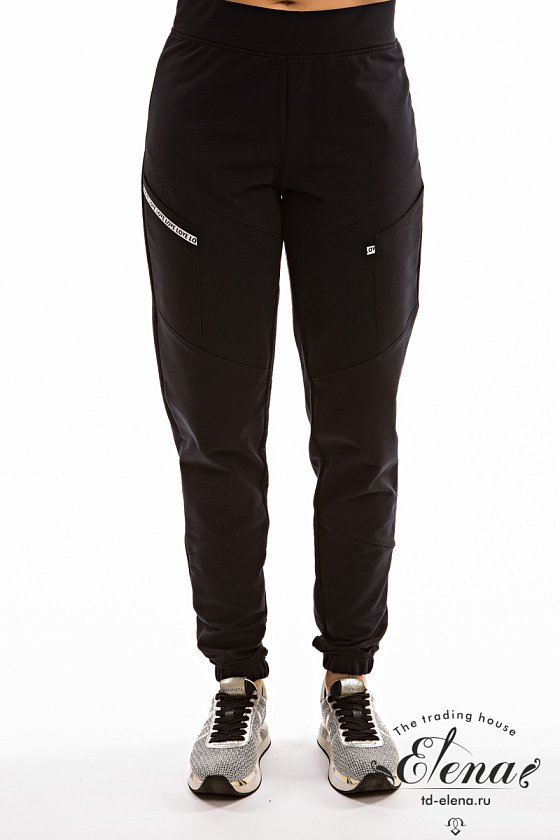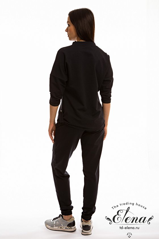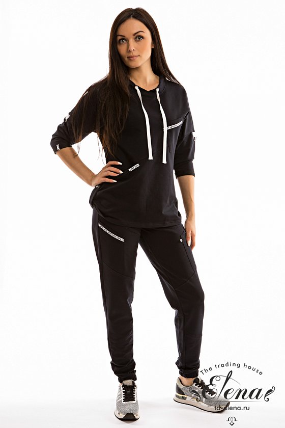 Костюм выполнен из футер петли с лайкрой. Состоит из брюк и толстовки. Толстовка со спущенной линией плеча, рукавом длиной 3/4, в горловине через люверсы проложен шнур. Спереди расположены два кармана, по низу отделка паты. Брюки с резиной на поясе и по низу, по бокам размещены карманы. Детали костюма с отделкой декоративными элементами и репсовой лентой.