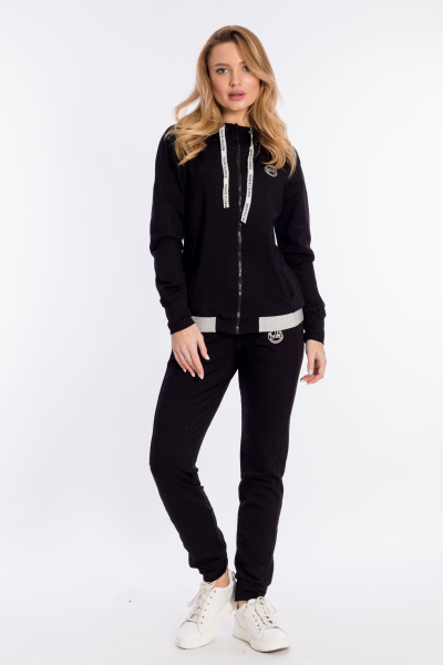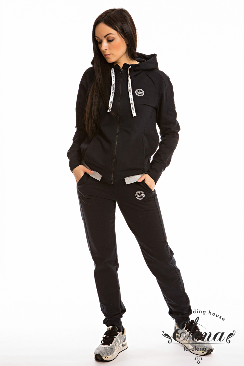 Женский костюм выполнен из однотонного футера с лайкрой. Толстовка на молнии, с рукавом покроя реглан на манжете, ширина капюшона регулируется при помощи тесьмы. Спереди термопечать, по бокам расположены карманы, пояс толстовки из декоративной резинки. На рукавах толстовки и брюках отделочные боковые вставки. Брюки с термопечатью, поясом на резине и манжетами внизу, по бокам карманы.