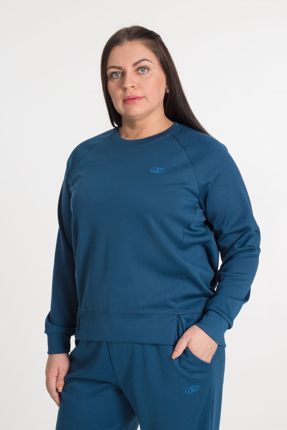 Толстовка - рукав реглан, притачные манжеты, пояс из двух частей, на полочке рельефы и вышивка, внизу небольшие разрезы