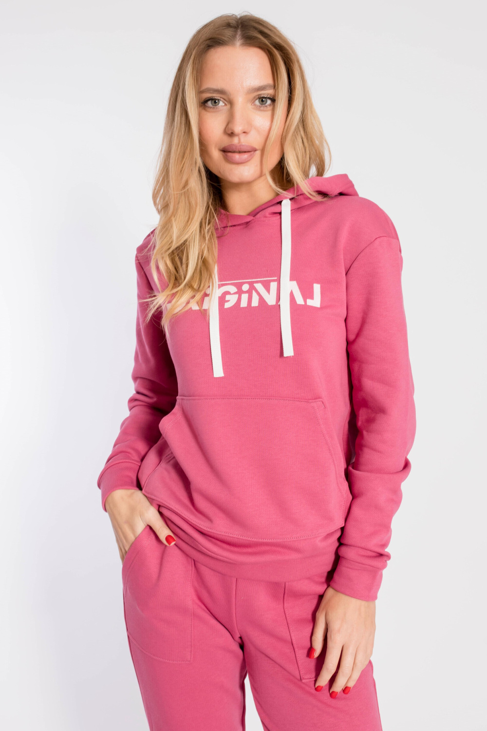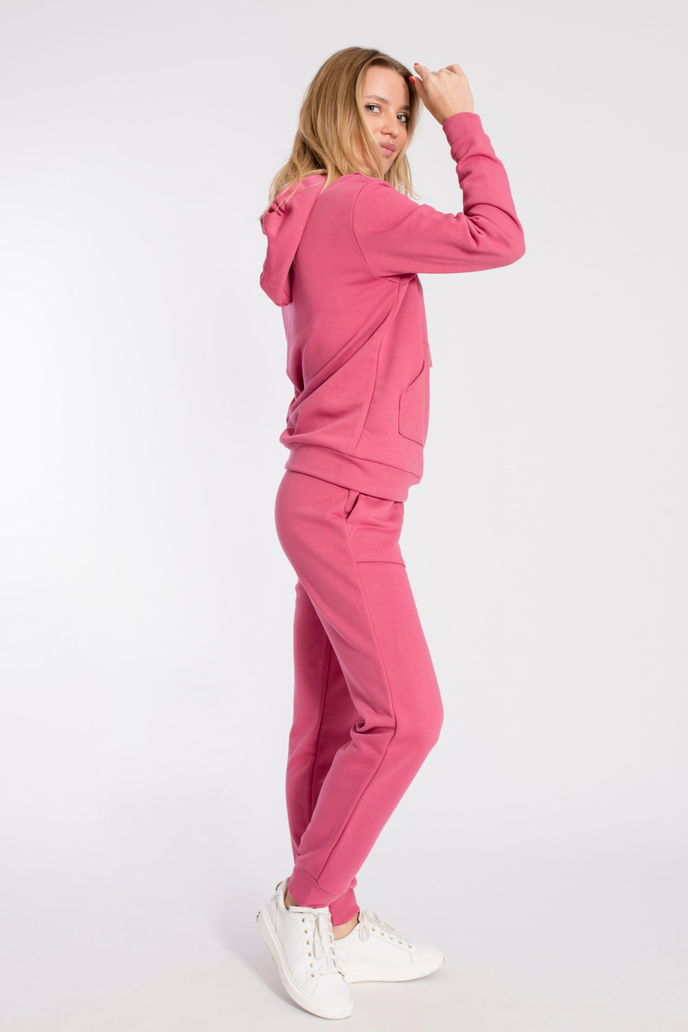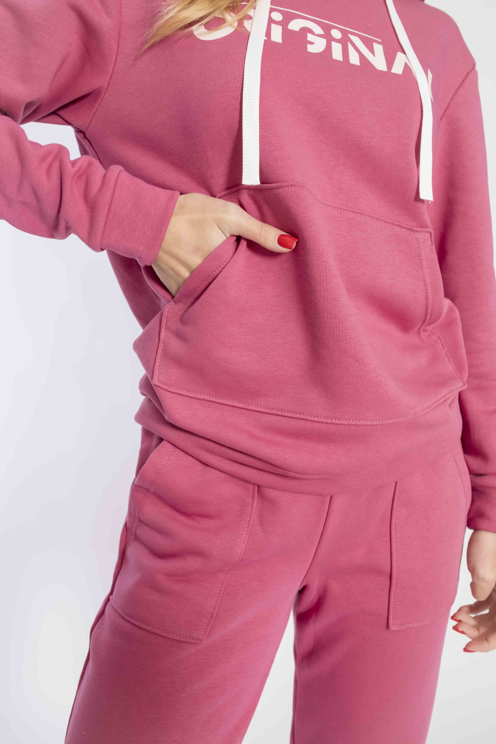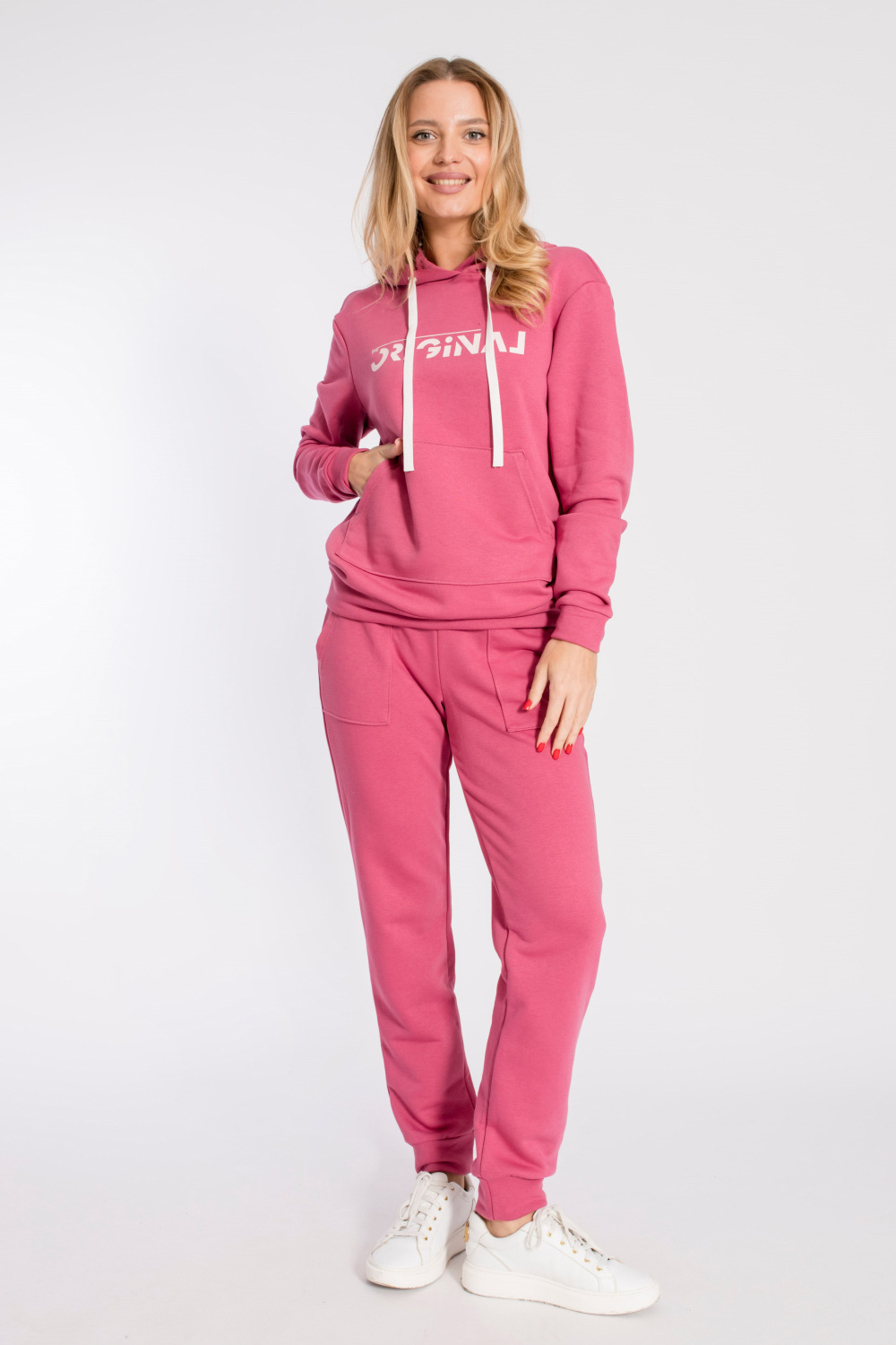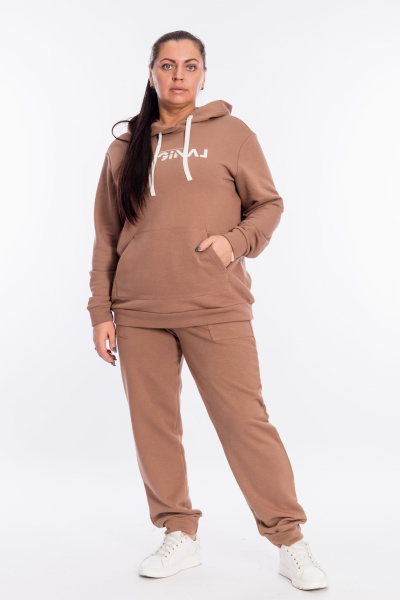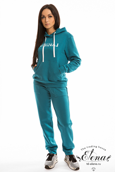Костюм выполнен из футера трёхнитка "воздушка". Состоит из толстовки с капюшоном, длинные рукава заканчиваются манжетами из основного полотна. Спереди расположен карман-кенгуру. Брюки с поясом на резине, низ манжетах из основного полотна, спереди расположены два накладных кармана. Спереди на толстовке и сзади на брюках нанесён принт.