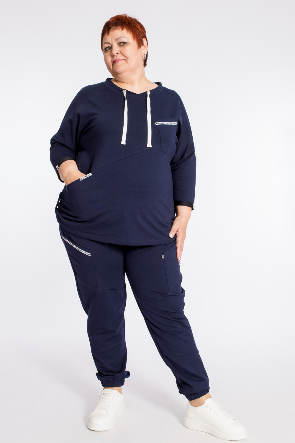 Костюм выполнен из футер петли с лайкрой. Состоит из брюк и толстовки. Толстовка со спущенной линией плеча, рукавом длиной 3/4, в горловине через люверсы проложен шнур. Спереди расположены два кармана, по низу отделка паты. Брюки с резиной на поясе и по низу, по бокам размещены карманы. Детали костюма с отделкой декоративными элементами и репсовой лентой.