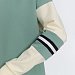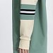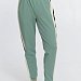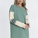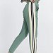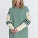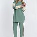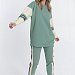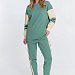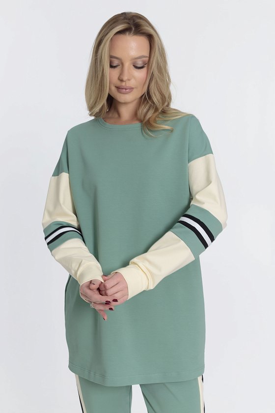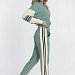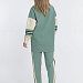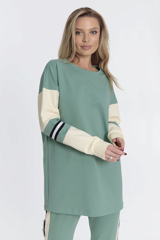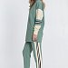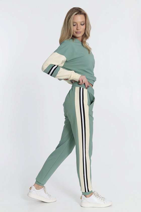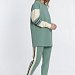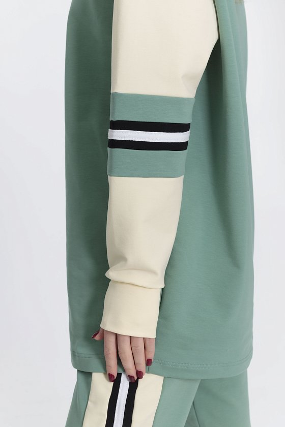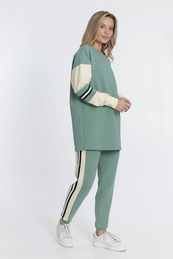 Костюм выполнен из футер петли с лайкрой. Толстовка свободная, удлинённого силуэта, линия плеча спущена. Длинные рукава заканчиваются манжетами, круглый вырез горловины оформлен планкой. Брюки с притачным поясом, манжетами и боковыми карманами. На рукавах толстовки и на брюках отделочные полосы с лампасами.