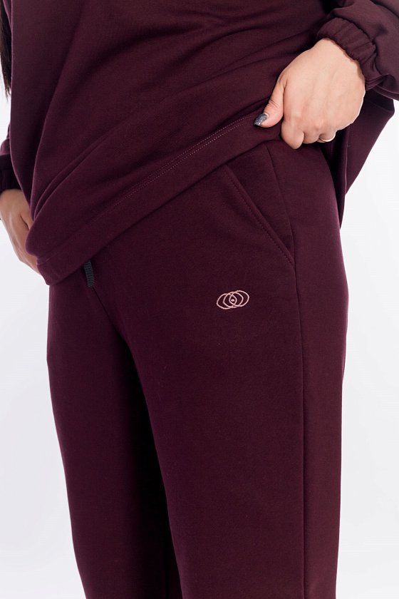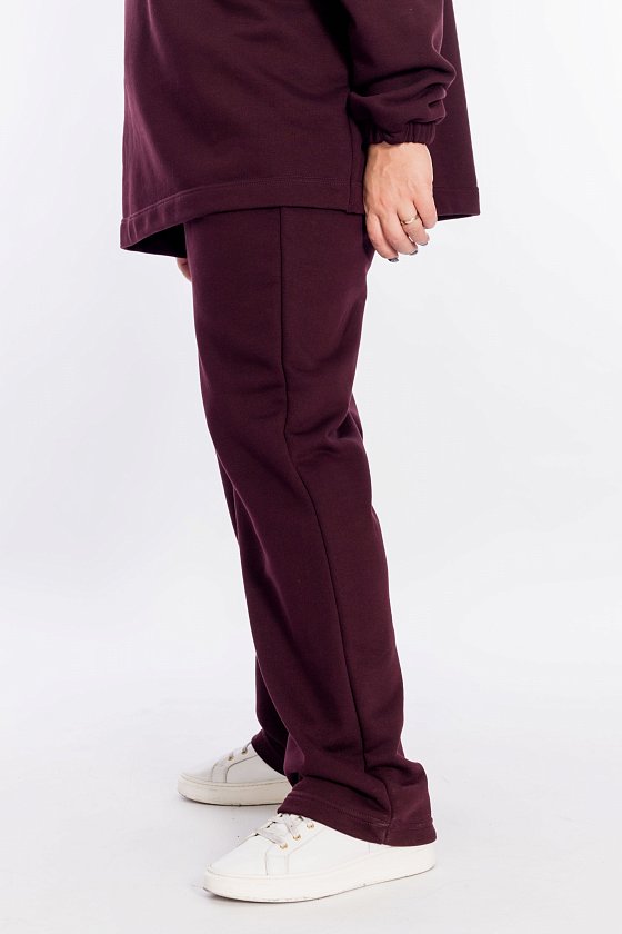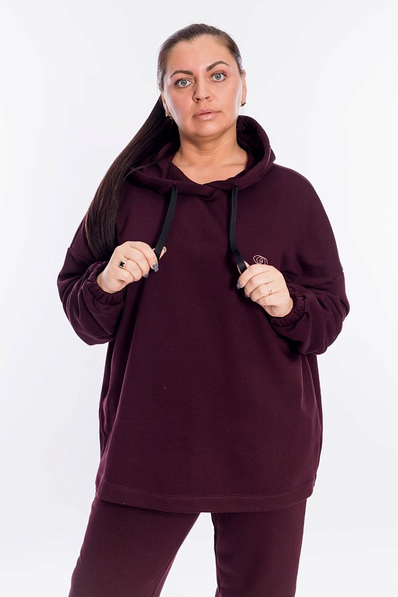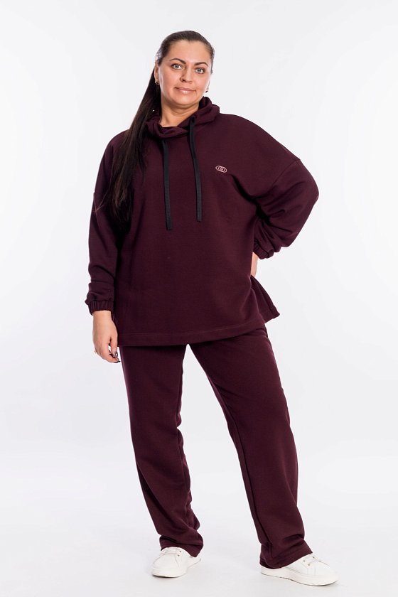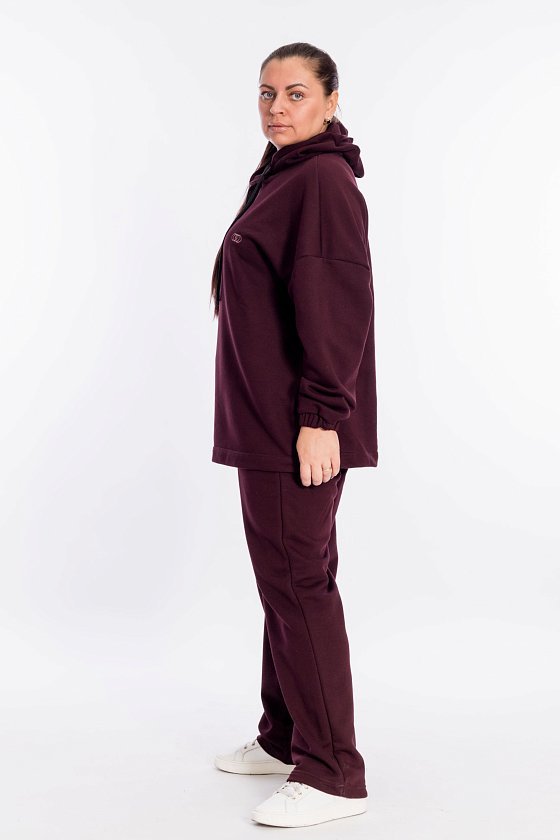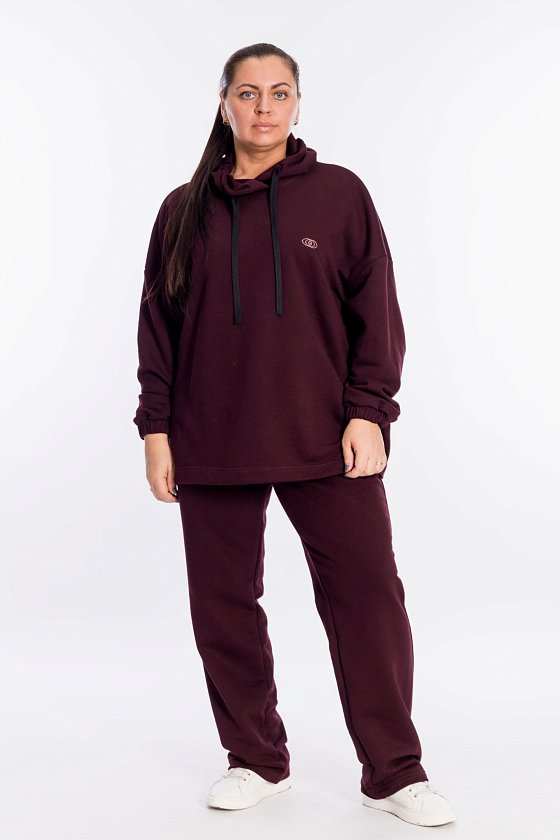 Костюм выполнен из однотонного футера трёхнитки (воздушка). Толстовка с капюшоном на шнуре, линия плеча спущена, рукав внизу с притачным манжетом с резинкой. Силует толстовки свободный, с левой стороны расположена логотипная вышивка. Брюки с боковыми карманами, пояс фиксируется при помощи резины и шнура. С левой стороны вышивка.