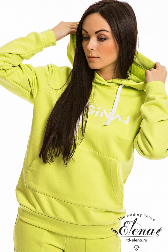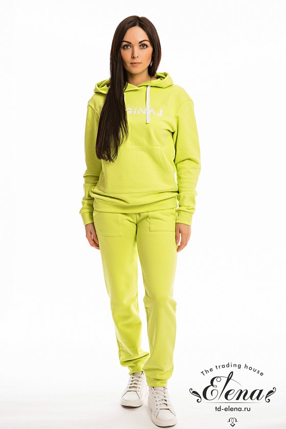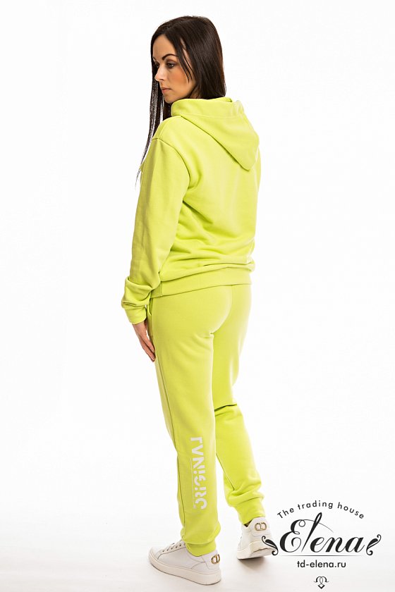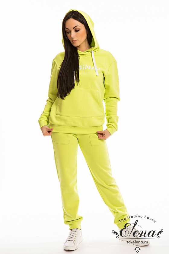Костюм выполнен из футера трёхнитка "воздушка". Состоит из толстовки с капюшоном, длинные рукава заканчиваются манжетами из основного полотна. Спереди расположен карман-кенгуру. Брюки с поясом на резине, низ манжетах из основного полотна, спереди расположены два накладных кармана. Спереди на толстовке и сзади на брюках нанесён принт.