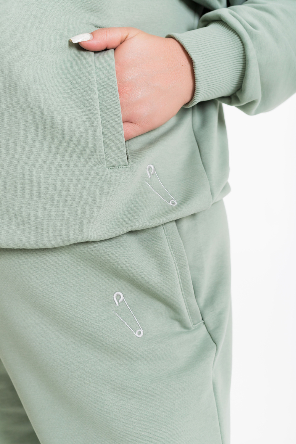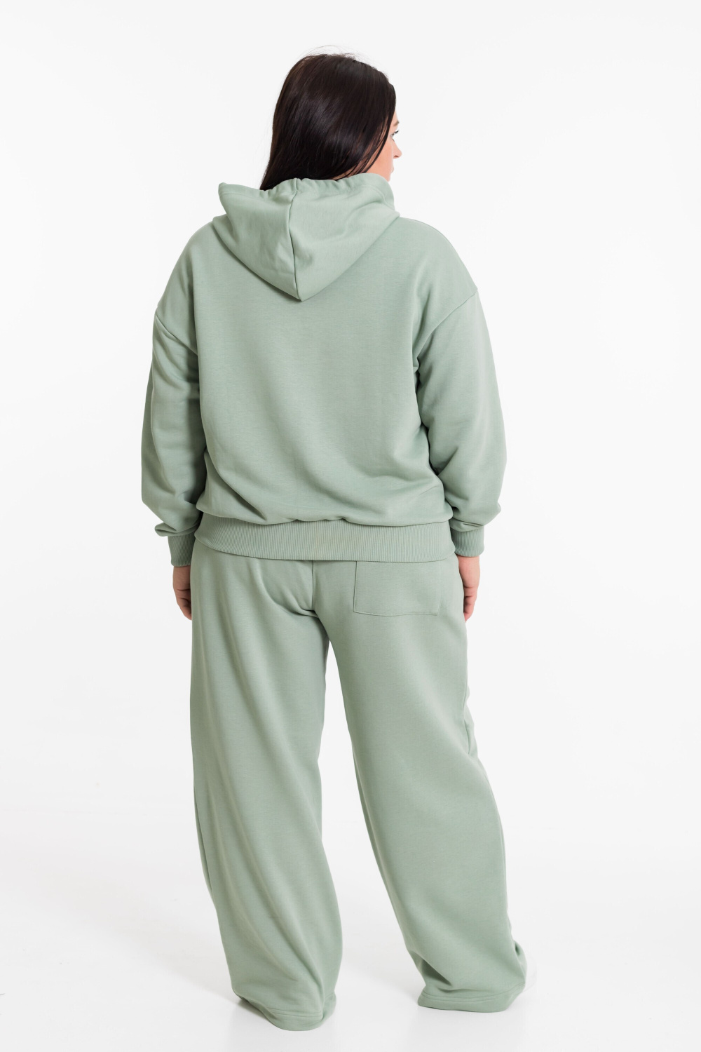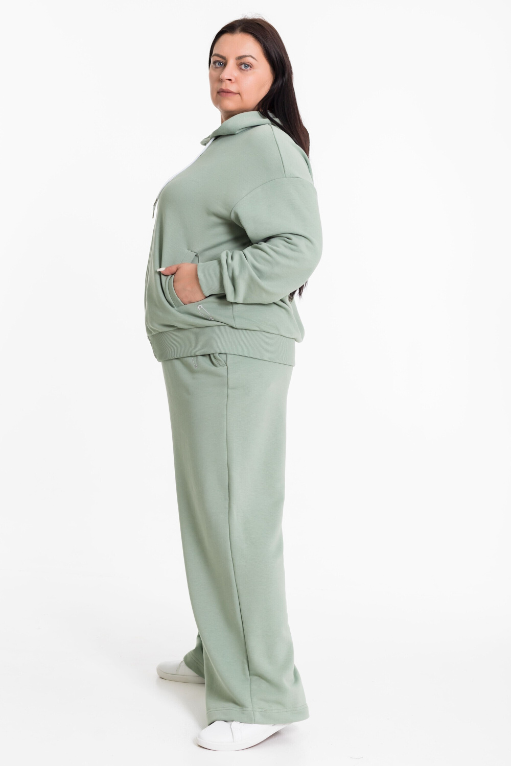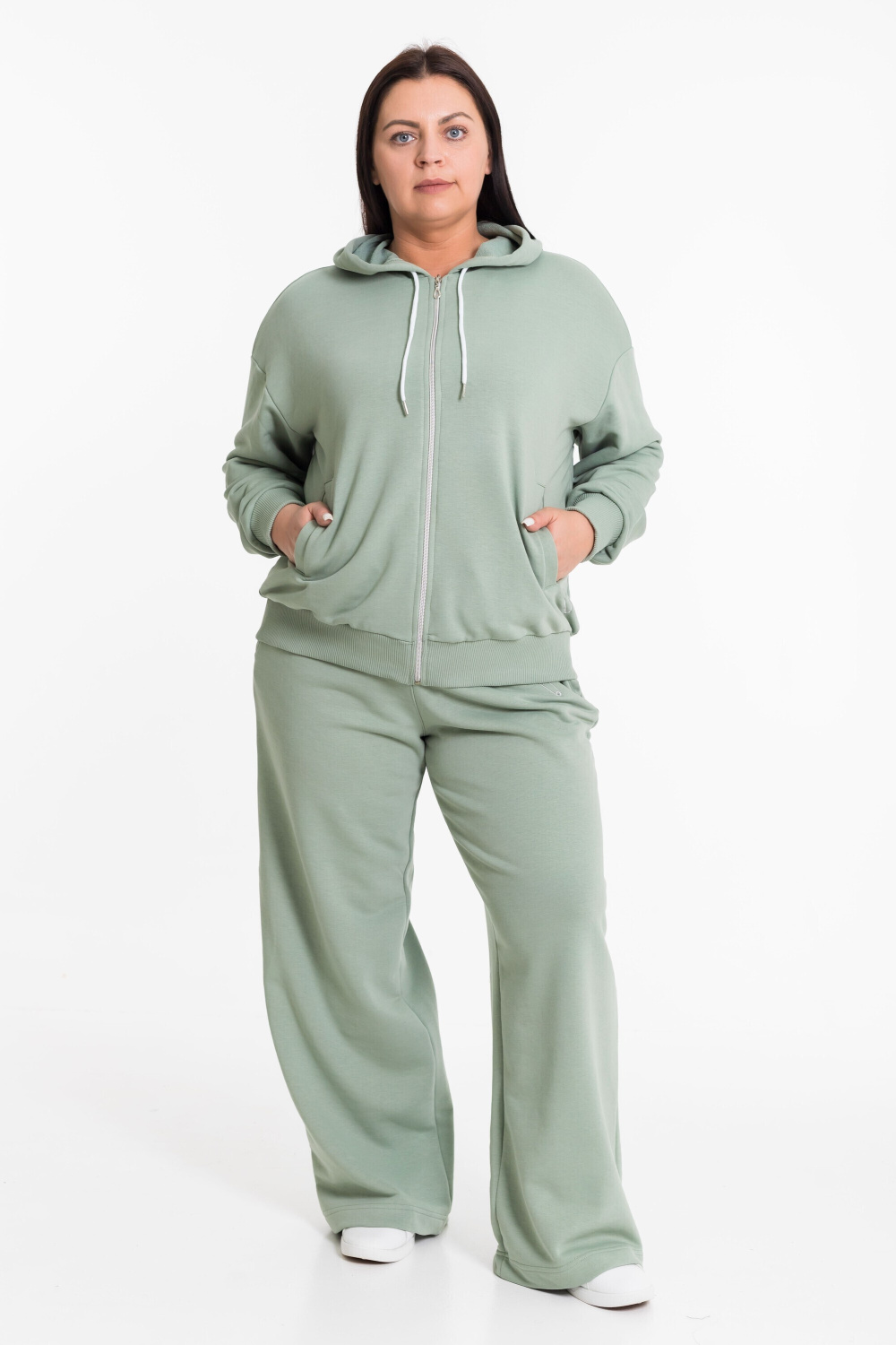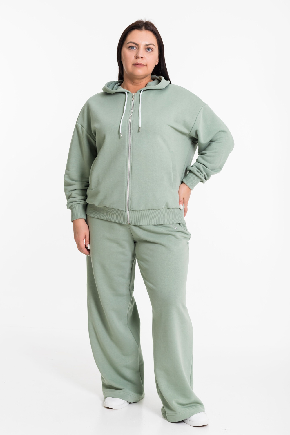 Костюм выполнен из однотонного футера воздушки и состоит из толстовки и брюк. Толстовка с капюшоном и центральной застежкой на разъёмную молнию. По бокам размещены карманы. Пояс и манжеты толстовки из кашкорсе. Брюки с боковыми карманами и накладным карманом сзади. Пояс брюк резинке. На толстовке и брюках сделана оригинальная вышивка.
