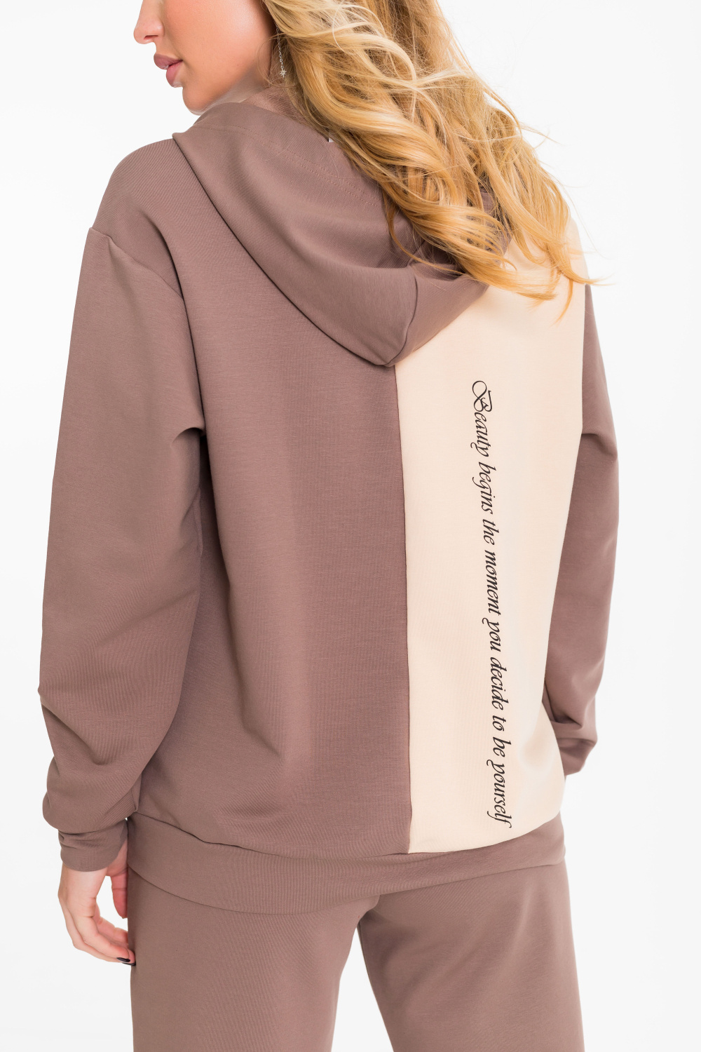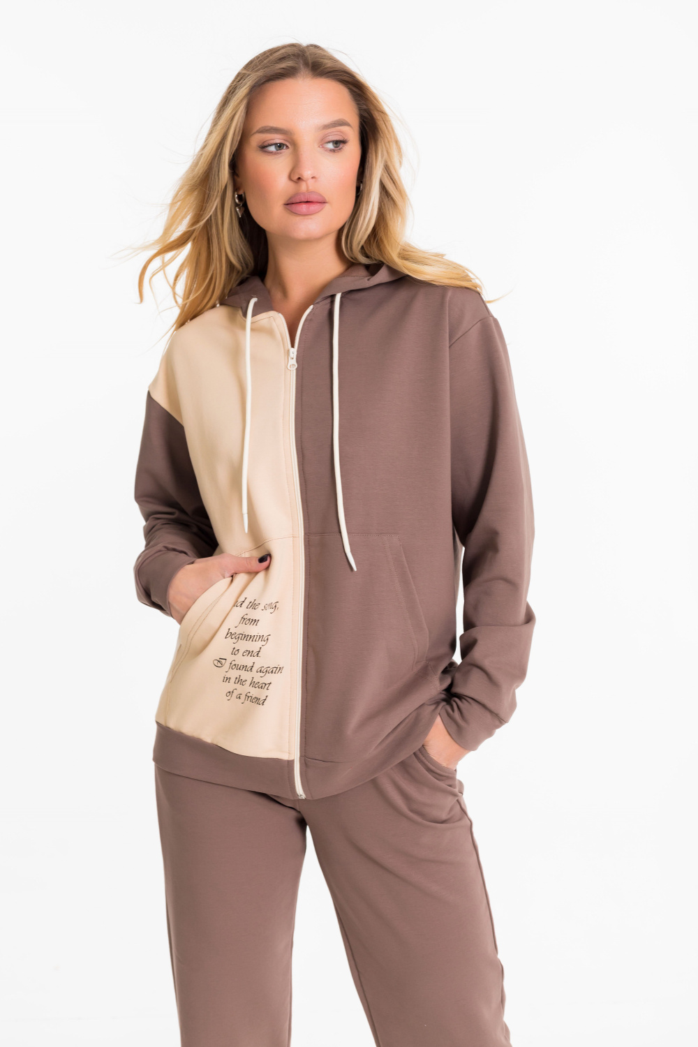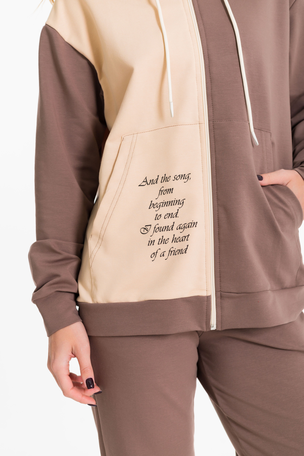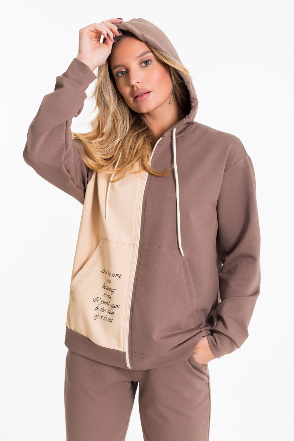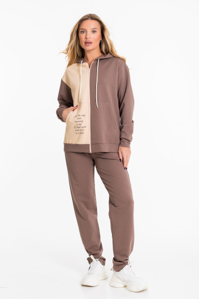 Женский костюм выполнен из однотонного футера с лайкрой двух цветов и состоит из толстовки и брюк. Толстовка с центральной застежкой на молнию, капюшоном и карманами кенгуру. Спереди и на спинке нанесён принт. Брюки с боковыми карманами и притачным поясом на резинке.