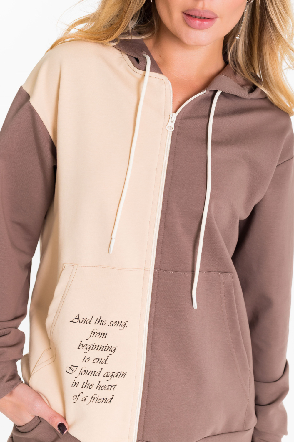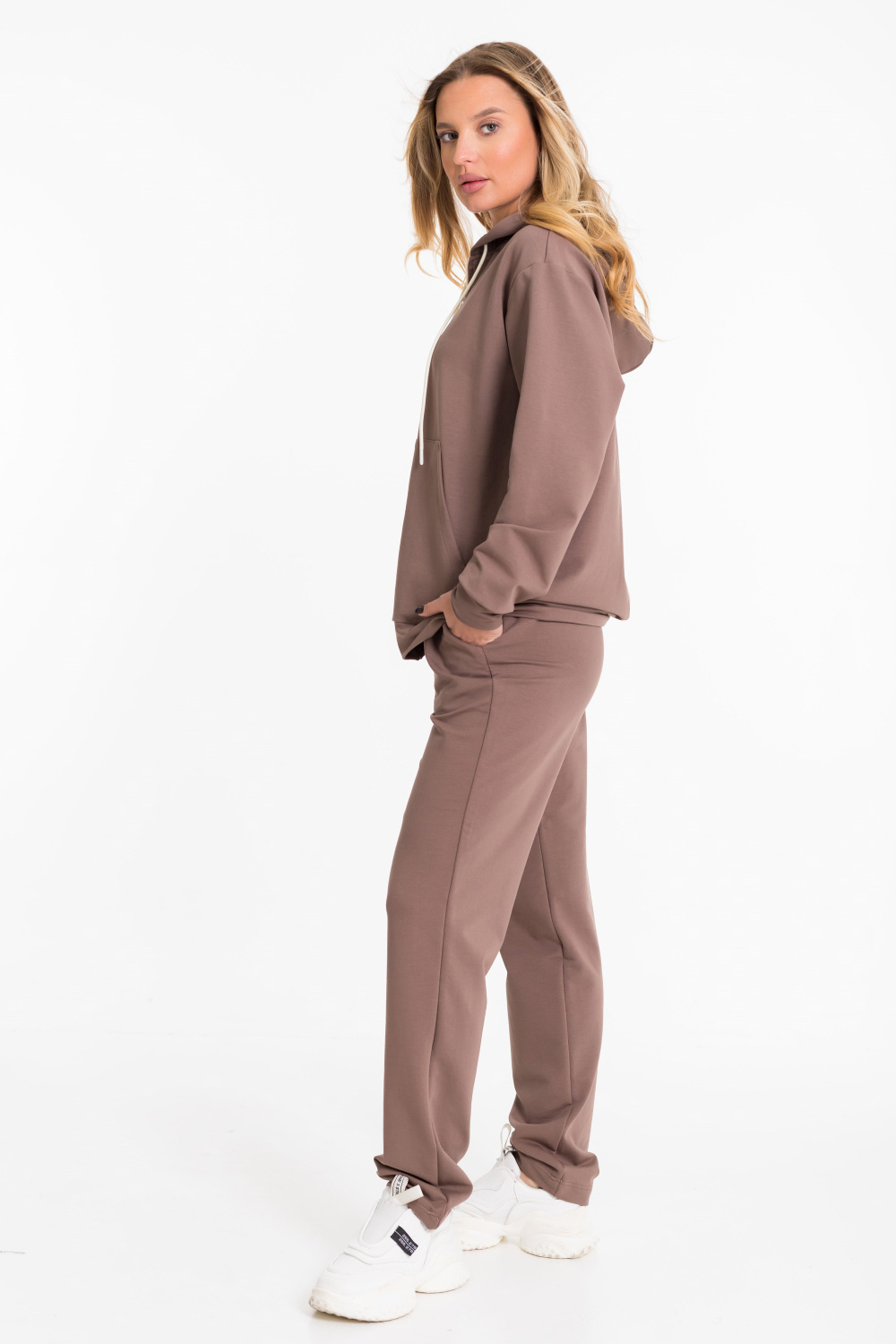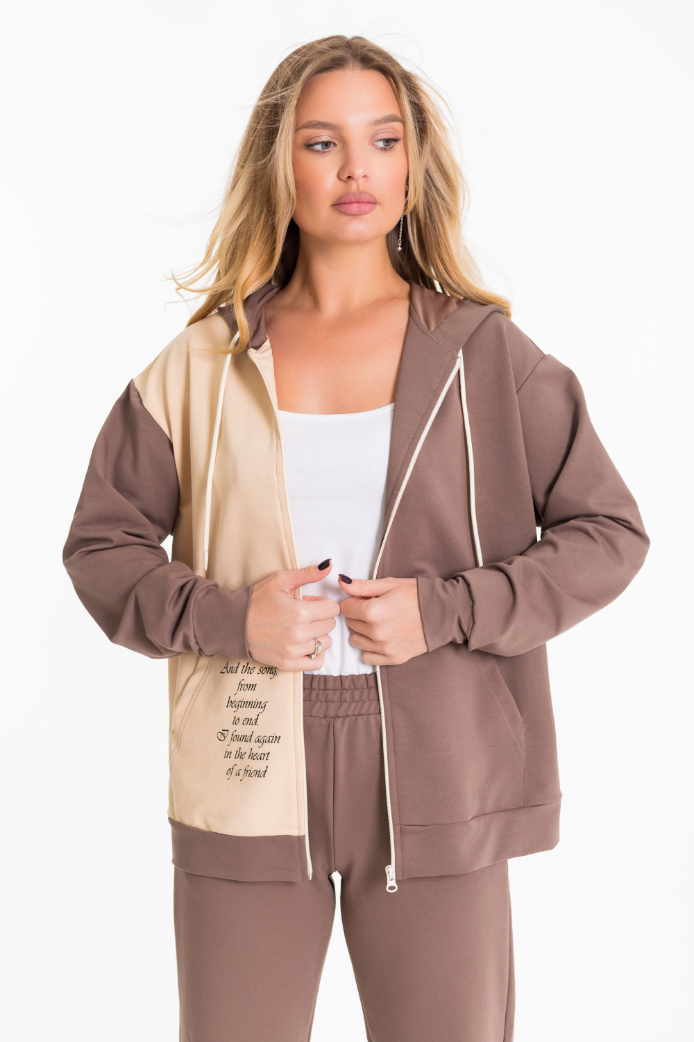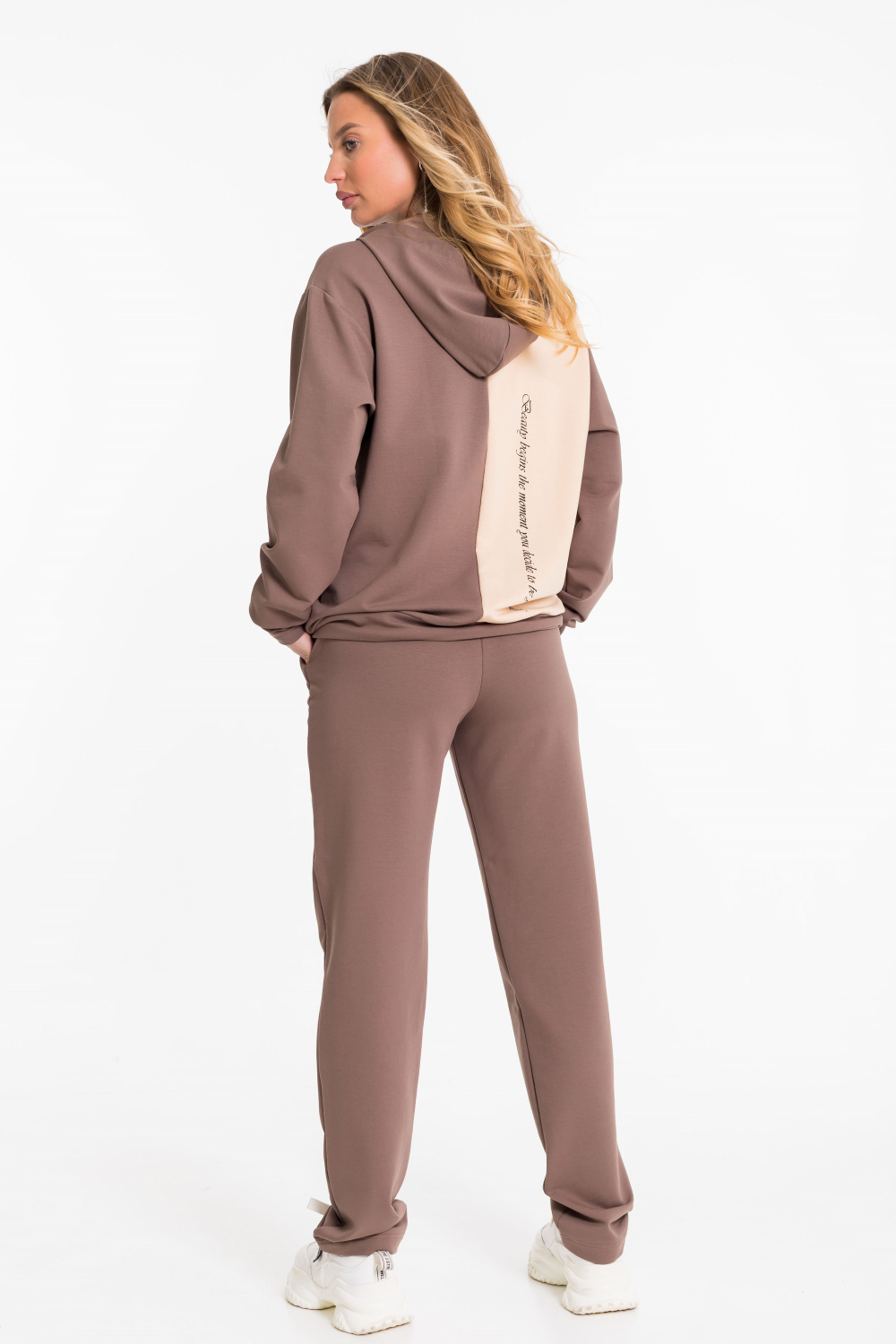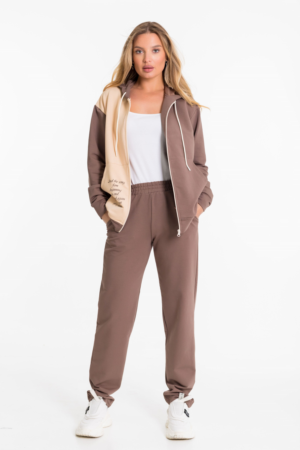 Женский костюм выполнен из однотонного футера с лайкрой двух цветов и состоит из толстовки и брюк. Толстовка с центральной застежкой на молнию, капюшоном и карманами кенгуру. Спереди и на спинке нанесён принт. Брюки с боковыми карманами и притачным поясом на резинке.