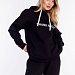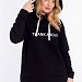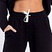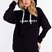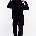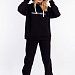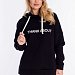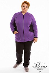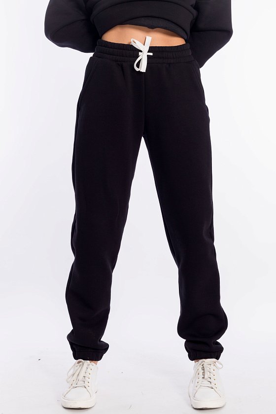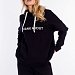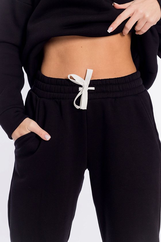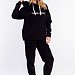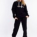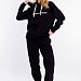 Женский костюм выполнен из однотонного полотна с начёсом. Толстовка удлинённая, cо спущенной линией плеча и капюшоном со шнуром. Спереди на толстовке нанесён принт. Брюки с карманами по бокам, низ на резине. Пояс на резине и шнуре.